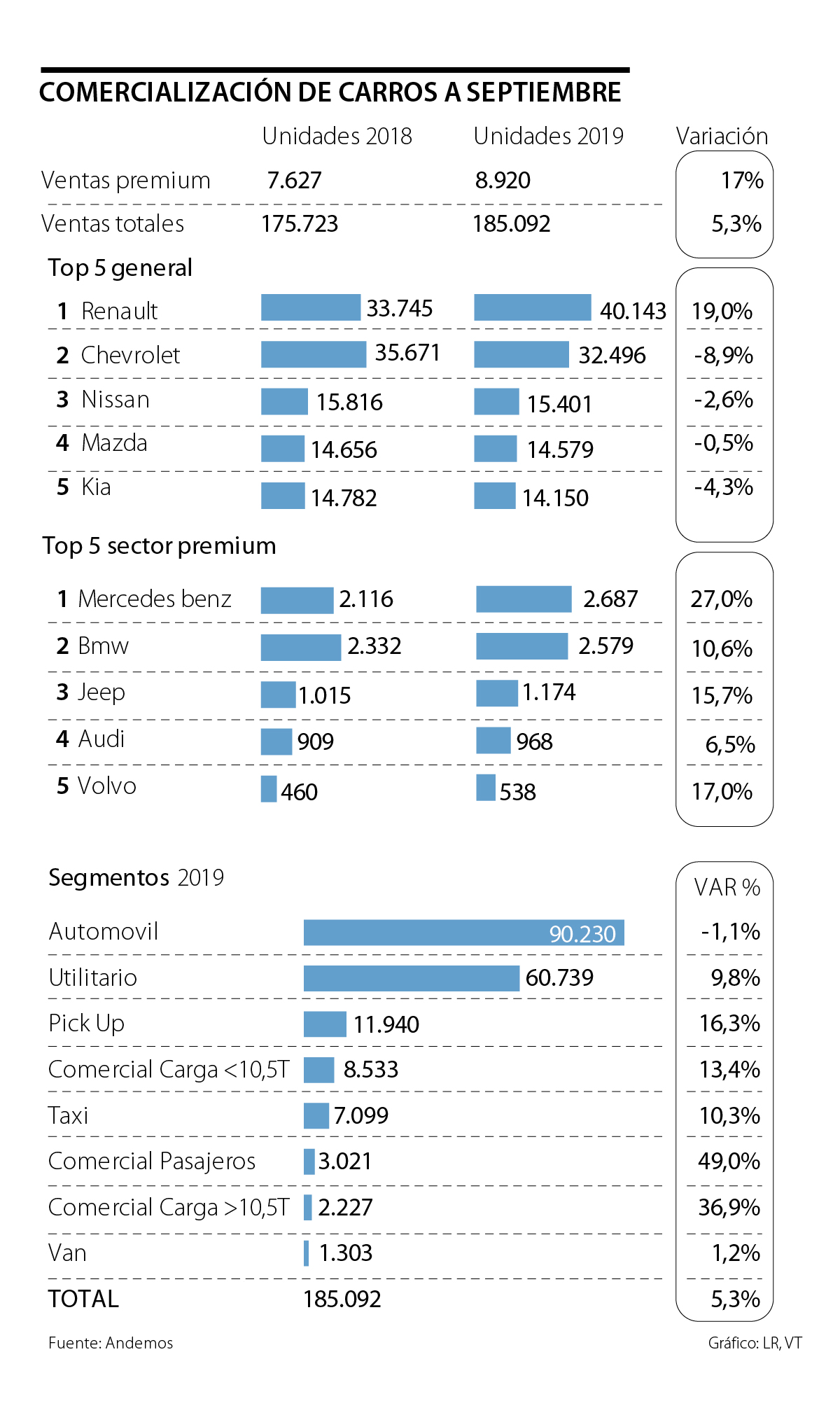 Ahora, hay marcas que siguen sacando la cara por sus números positivos según el más reciente informe de Andemos. Por ejemplo, de los 185.092 carros comercializados en el año, destacan los 40.143 que ha vendido Renault, que sigue liderando en la industria no solo en número de unidades comercializadas, sino por el alza de 19% frente a las ventas que se hicieron en los primeros nueve meses del año pasado.