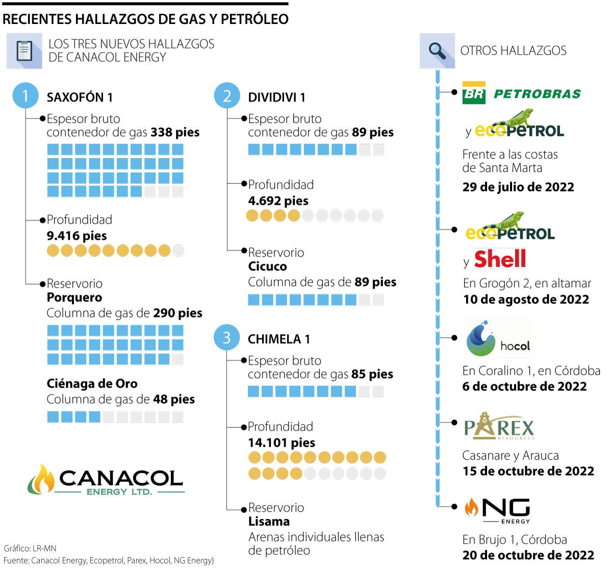 Con esto, Canacol se suma a los recientes descubrimientos de otras exploradoras del sector como NG Energy International, Parex Resources, Hocol y Ecopetrol durante 2022 (Ver gráfico). “Siempre es importante para el país que se den nuevos descubrimientos que permitan evaluar nuevas posibilidades y el aumento de las reservas y la autosuficiencia”, dijo Julio César Vera, presidente de Xua Energy.