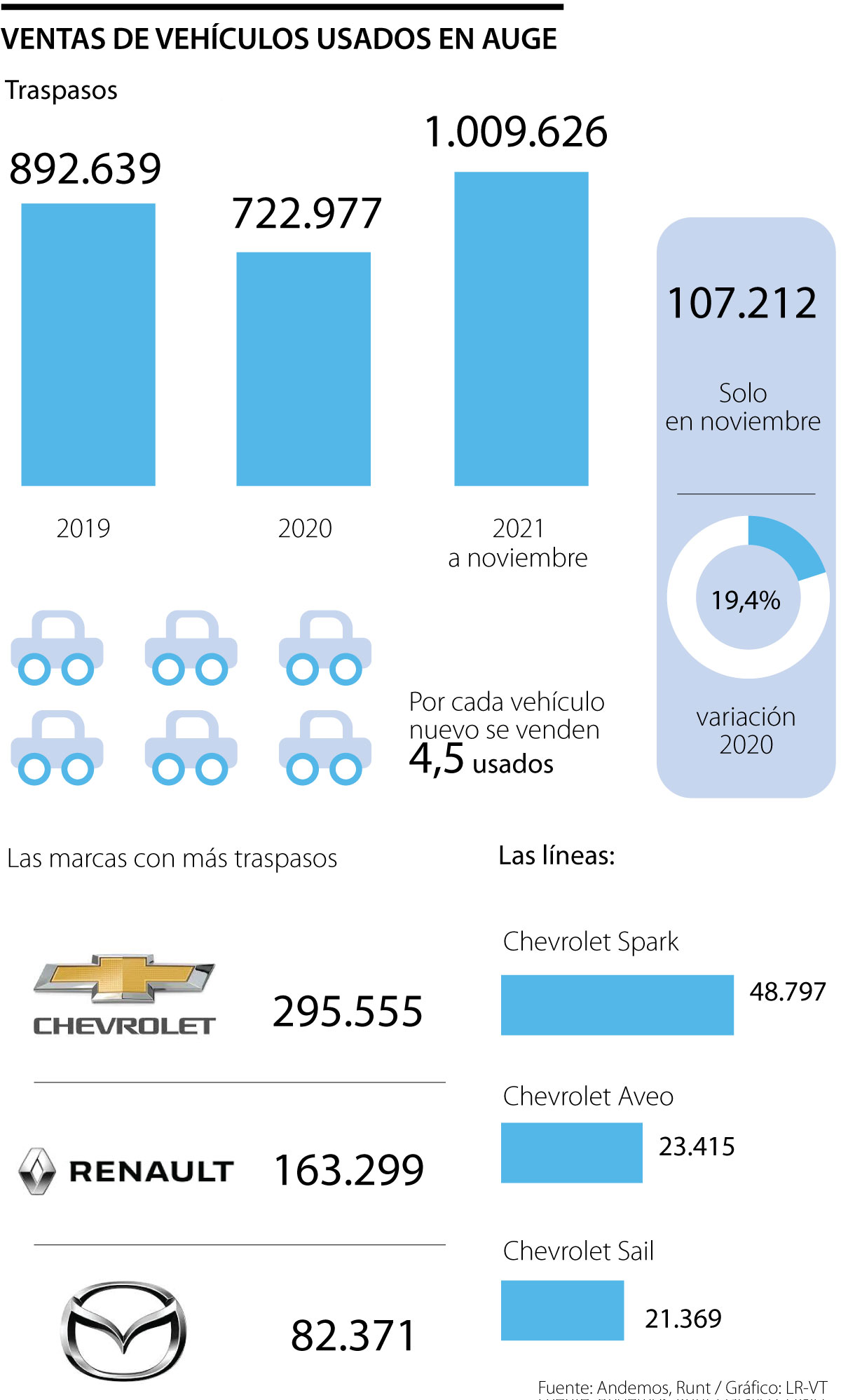 Andemos, con cifras del Runt, reportó que con corte a noviembre se vendieron 1.009.626 vehículos usados, por lo que la proporción es que por cada nuevo que sale al mercado, se realizan 4,5 traspasos. En 2020, esa misma proporción era de 3,8.