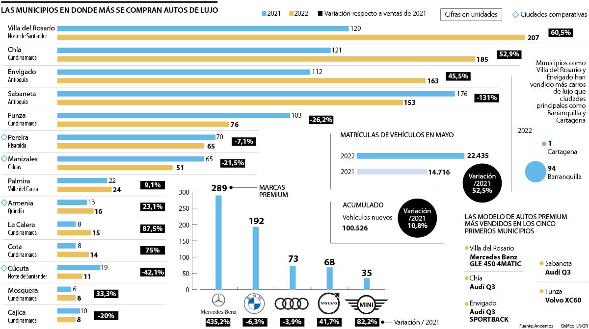 Otros municipios como Palmira,Valle, con 24 unidades vendidas en 2022; La Calera, con 15; Cota, con 14; y Mosquera y Cajicá, con ocho vehículos de alta gama, cierran el top 10 de los municipios en los que más se compran autos de lujo.