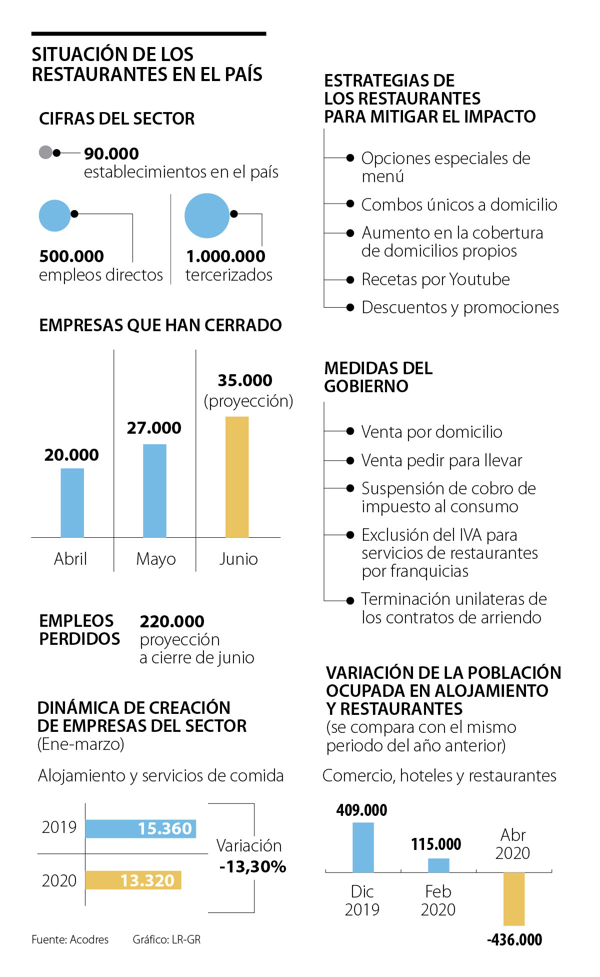 La situación de los restaurantes no da espera. De acuerdo con datos de Acodres, a cierre de 2019 había 90.000 establecimientos en el país. Debido a la pandemia, a finalizar mayo ya habían cerrado 27.600 y si la dinámica sigue así, quebrarían 35.000 negocios a finales de junio, es decir, más de una tercera parte del total.