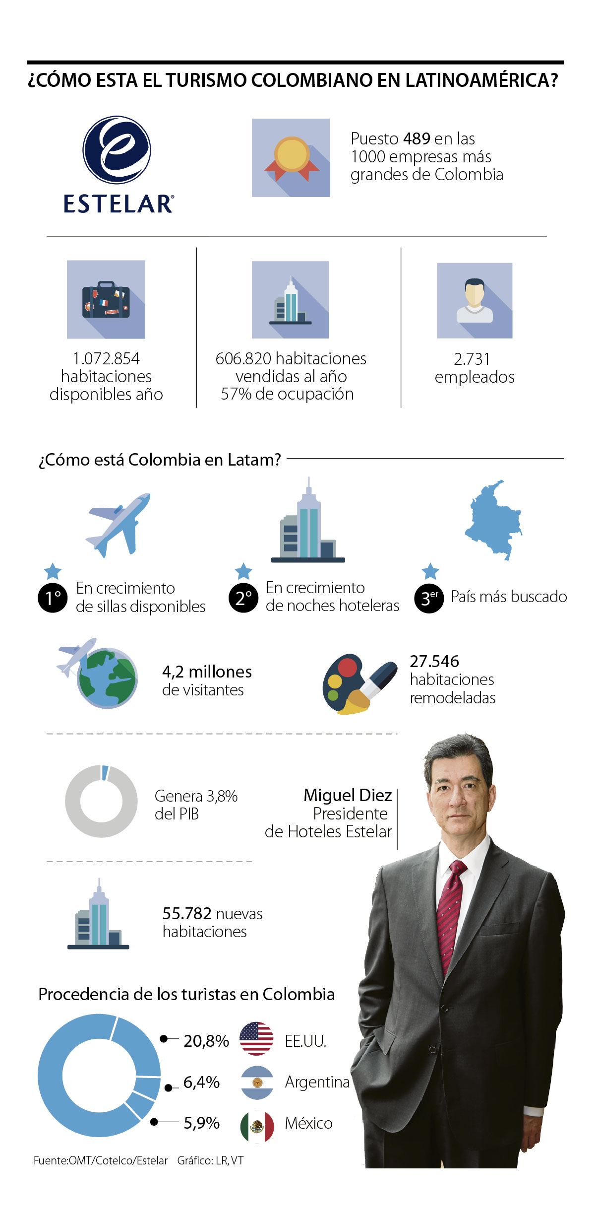 En el país, la cadena de Hoteles Estelar es uno de los potencializadores de estas cifras, gracias a su cubrimiento casi total en Colombia y su creciente expansión en Perú y Panamá. Miguel Diez, presidente de la sociedad, dijo en entrevista con LR que en línea con su plan estratégico seguirán apostando por tener un cubrimiento total en estos países, para seguir expandiéndose.