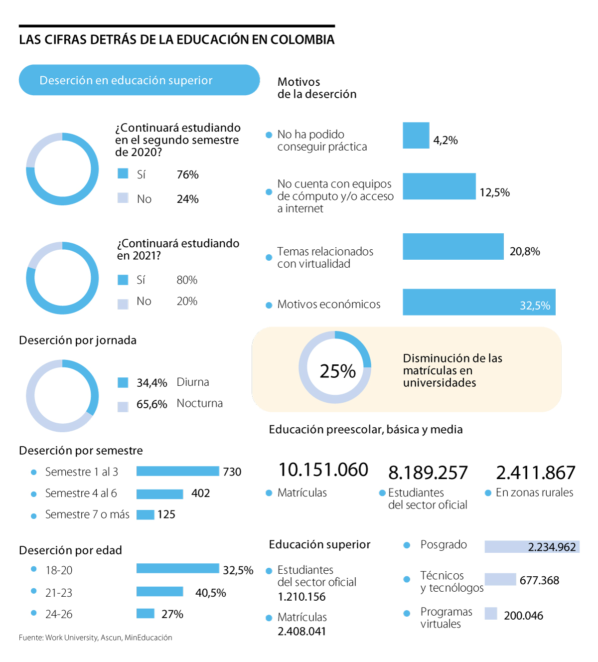 Los gobiernos a nivel mundial estudian diversas alternativas para retomar las clases bajo un modelo de semipresencialidad con el fin de mitigar el impacto de la coyuntura y la deserción estudiantil, que va en aumento. Óscar Domínguez, director ejecutivo de la Asociación Colombiana de Universidades, Ascun, develó que este semestre las matrículas podrían bajar hasta 25%.