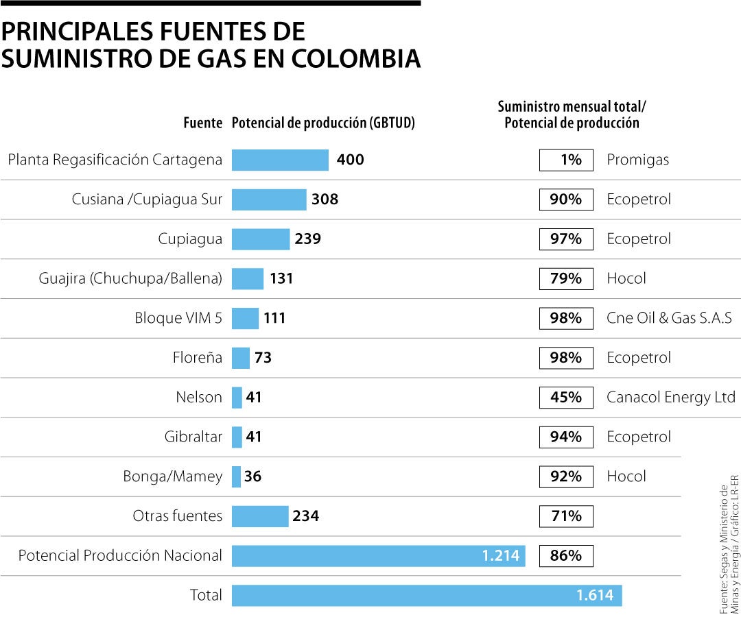 Cabe resaltar que la principal fuente de suministro de gas en Colombia es la planta Regasificación Cartagena, la cual cuenta con un potencia de 400 Gbtud (unidad térmica británica) y está a cargo de la empresa Promigas; la segunda es Cusiana y Cupiagua Sur (308 Gbtud), de Ecopetrol; Cupiagua (239 Gbtud), también de Ecopetrol; Chuchupa y Ballena (131 Gbtud), de Hocol, y Bloque VIM 5 (111 Gbtud), de Cne Oil & Gas S.A.S.