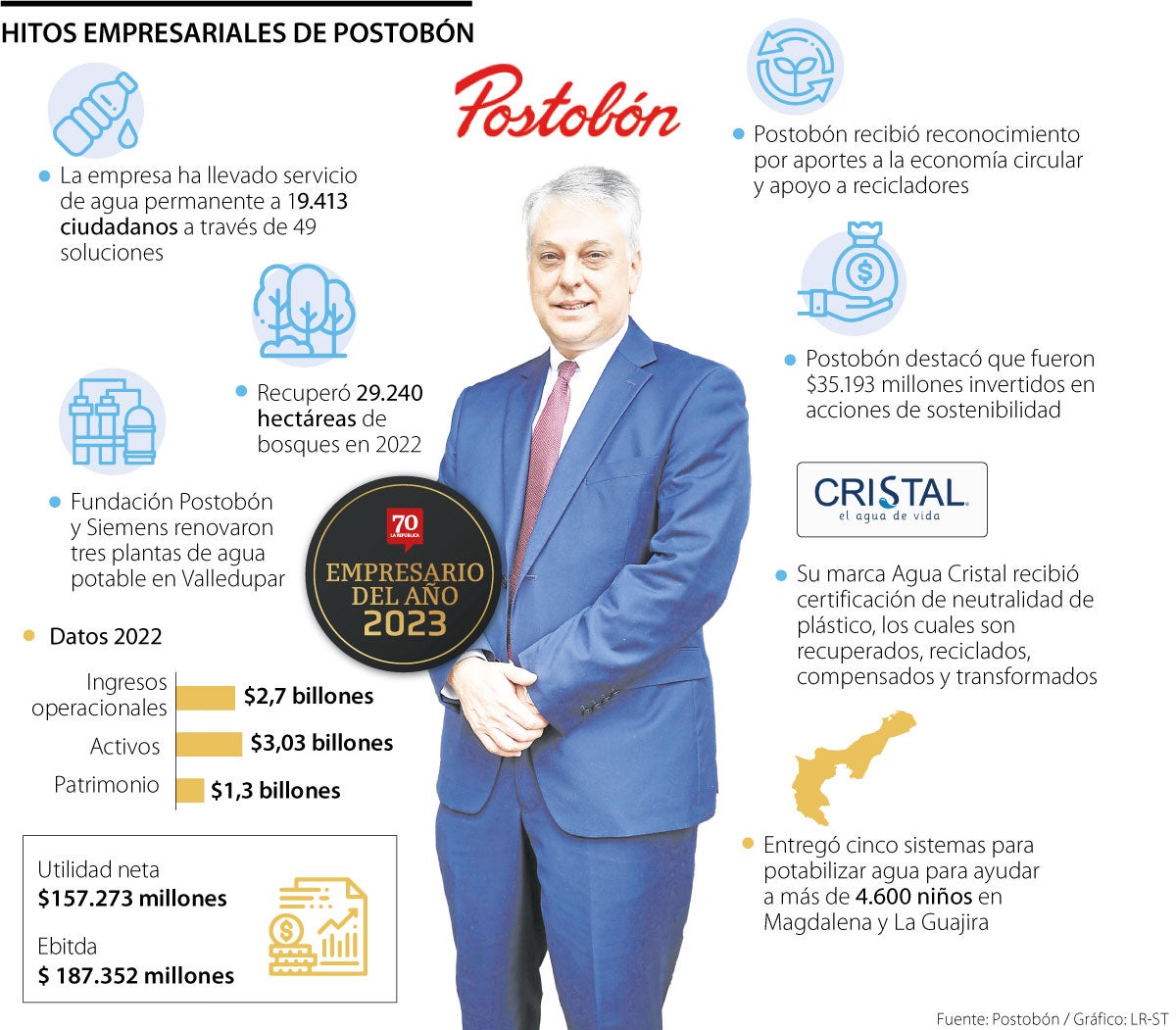 Parte de la historia de la compañía ha sido escrita por Miguel Escobar, su actual dirigente, quien tomó las riendas de la empresa desde 2013, y completó 10 años y nueve meses en el cargo. Escobar fue nominado a la distinción del Empresario del Año 2023 gracias al Índice de Mención Empresarial de LR, que contó, a partir de las 282 ediciones de 2023, el número de apariciones de Postobón.