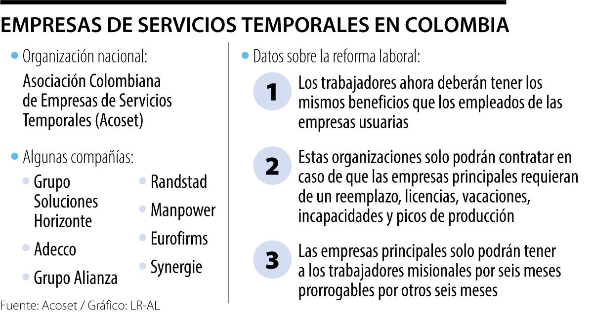 Al respecto, Nicolás Rico, socio de Scola Abogados, explicó que uno de los principales cambios a las empresas de servicios temporales es que ahora tendrían unas limitaciones con base a sus funciones. Estas organizaciones solo podrán contratar en caso de que las empresas principales requieran de un reemplazo, licencias, vacaciones, incapacidades, picos de producción y no en otras situaciones. “Tal vez lo más relevante y preocupante es que tratan de prohibir la utilización de EST para labores misionales permanentes de las empresas”, mencionó Rico.