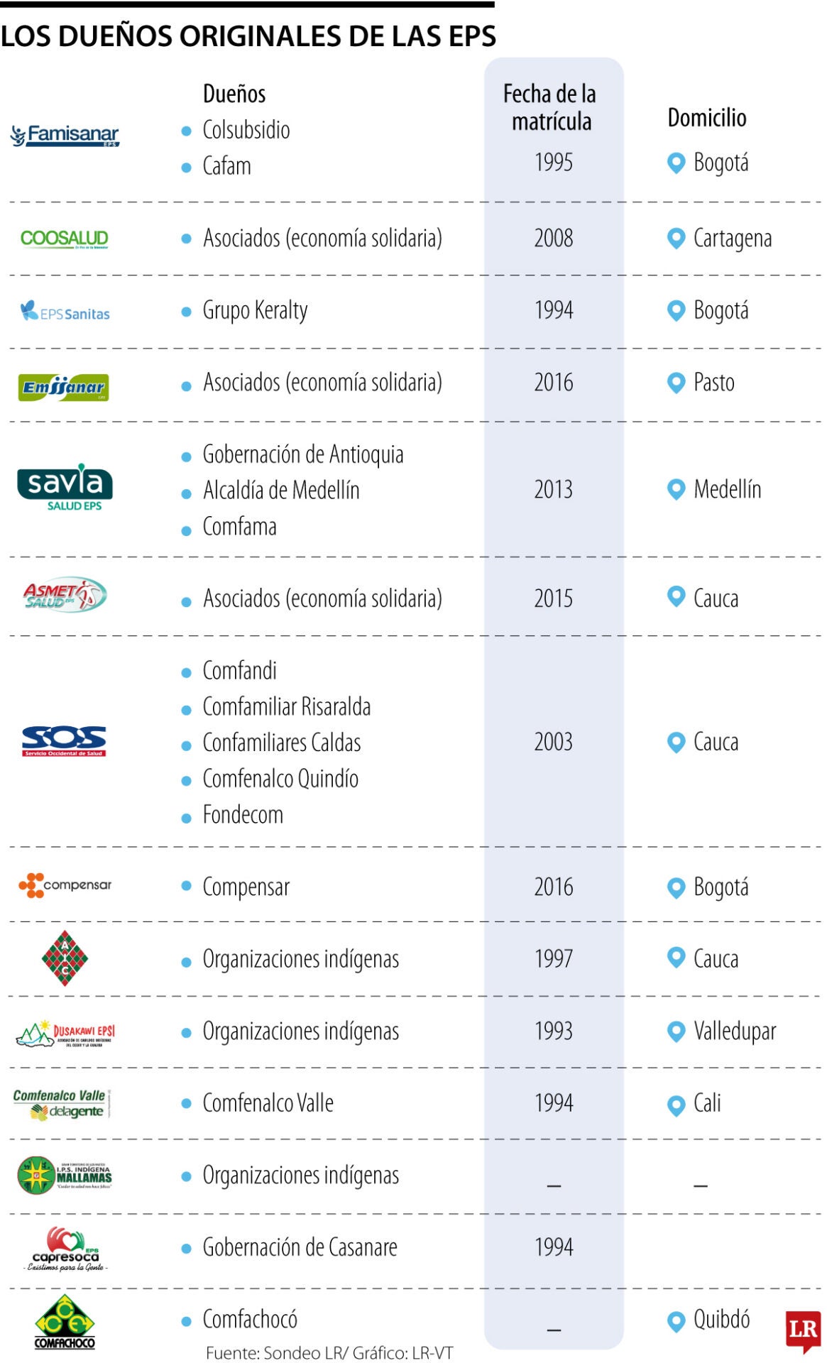 Fue así como a mediados de los 90 y principios de los 2000, las cajas más grandes -por su número de afiliados- crearon sus aseguradoras para el sistema público. Hoy, casi tres décadas después, y en línea con su patrimonio negativo, tendrían que desaparecer Famisanar, cuyos dueños originales son Colsubsidio y Cafam; SOS, creada por Comfandi, Confamiliar Risaralda, Confamiliares Caldas y Comfenalco Quindío; Compensar EPS, Comfenalco Valle EPS y Comfachocó EPS, que llevan el mismo nombre de las cajas que las fundaron.