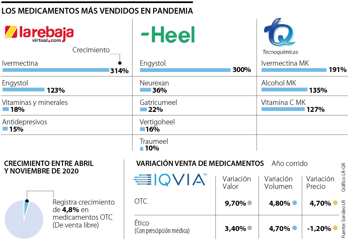 LR realizó un sondeo con algunas droguerías y laboratorios reconocidos en el país para conocer cuáles fueron los fármacos más vendidos, y la Ivermectina lideró el ranking con un aumento de hasta 314% (ver gráfico).