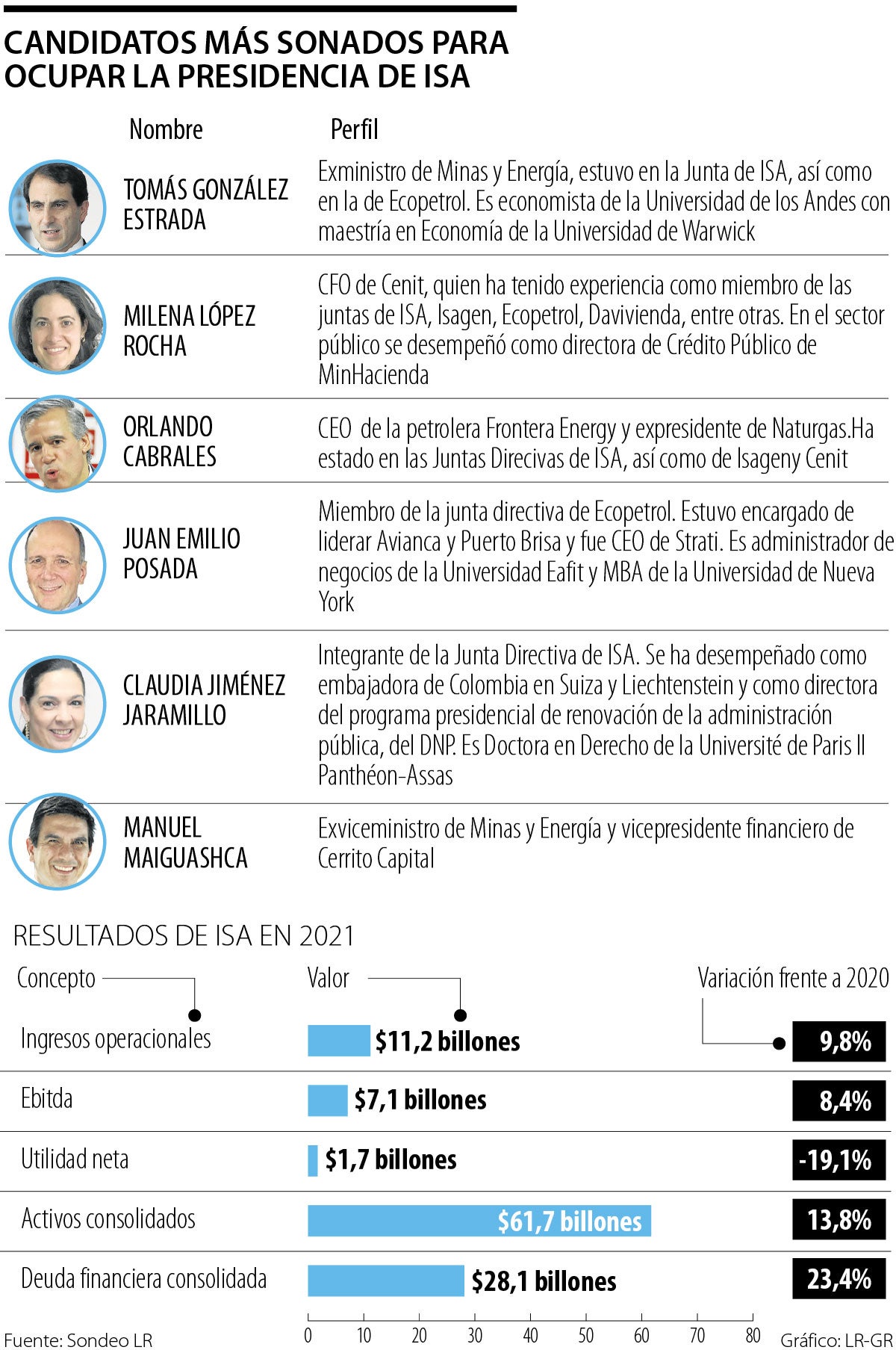 Entre los nombres que han sonado para ocupar la dirección del grupo se encuentran Tomás González, quien salió en 2016 del Ministerio de Minas y Energía y también estuvo en la Junta de ISA, así como en la de Ecopetrol; Milena López Rocha, actual CFO de Cenit, quien ha tenido experiencia como miembro de las juntas de ISA, Isagen, Ecopetrol, Davivienda, entre otras, y, en el sector público, fue directora de Crédito Público de MinHacienda; y Orlando Cabrales, CEO de Frontera Energy, y quien antes había presidido Naturgas; como los ejecutivos anteriores, también ha estado en las Junta de ISA, así como de Isagen, Cenit, entre otras.