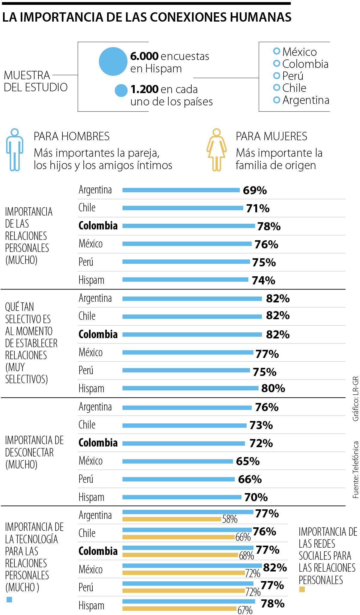 La primera conclusión del estudio es que para tres de cada cuatro latinos, las relaciones personales son muy importantes; en el caso de Colombia, el dato es un poco más alto de la media, ubicándose en 78%.