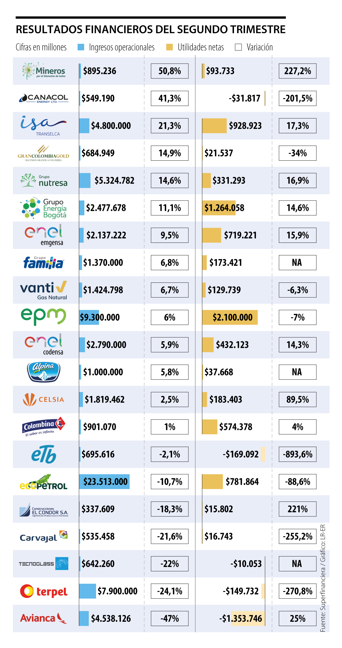 A pesar de las caídas en la facturación, hubo empresas que aumentaron sus ingresos, pero entre las que menos redujeron sus ventas a junio destaca ETB, que solo vio una reducción de 2,1% en sus ingresos a junio y facturó $695.616 millones. La compañía registró pérdidas por $169.092 millones, lo que equivale a una caída de 893,6% en el resultado de su ejercicio.