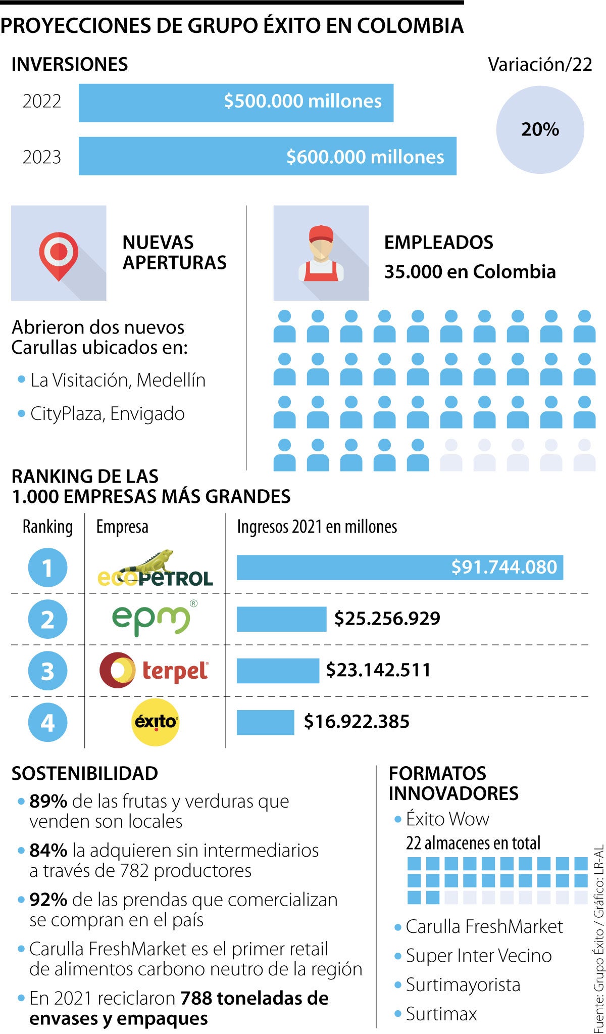 Para la muestra están las cifras. Recientemente, Grupo Éxito, presidido por Carlos Mario Giraldo Moreno, anunció la colocación de $500.000 millones en inversiones para Colombia, al cierre de 2022. Pero, no solo eso, sino que el holding ya anunció y aseguró cuáles serán sus inversiones para 2023: estarán por el orden de $600.000 millones, que sería 20% que las proyectadas para este año. Además, hoy se encuentra inaugurando la apertura de dos nuevos supermercados Carulla , en Antioquia. Lo que sería un mensaje más de su estabilidad en Colombia. “En Grupo Éxito seguimos apostándole a la dinamización de la economía del país, la generación de empleo y el apoyo a proveedores locales”, dijo Giraldo. Actualmente, el conglomerado emplea a más de 35.000 personas en Colombia, en sus diferentes divisiones.