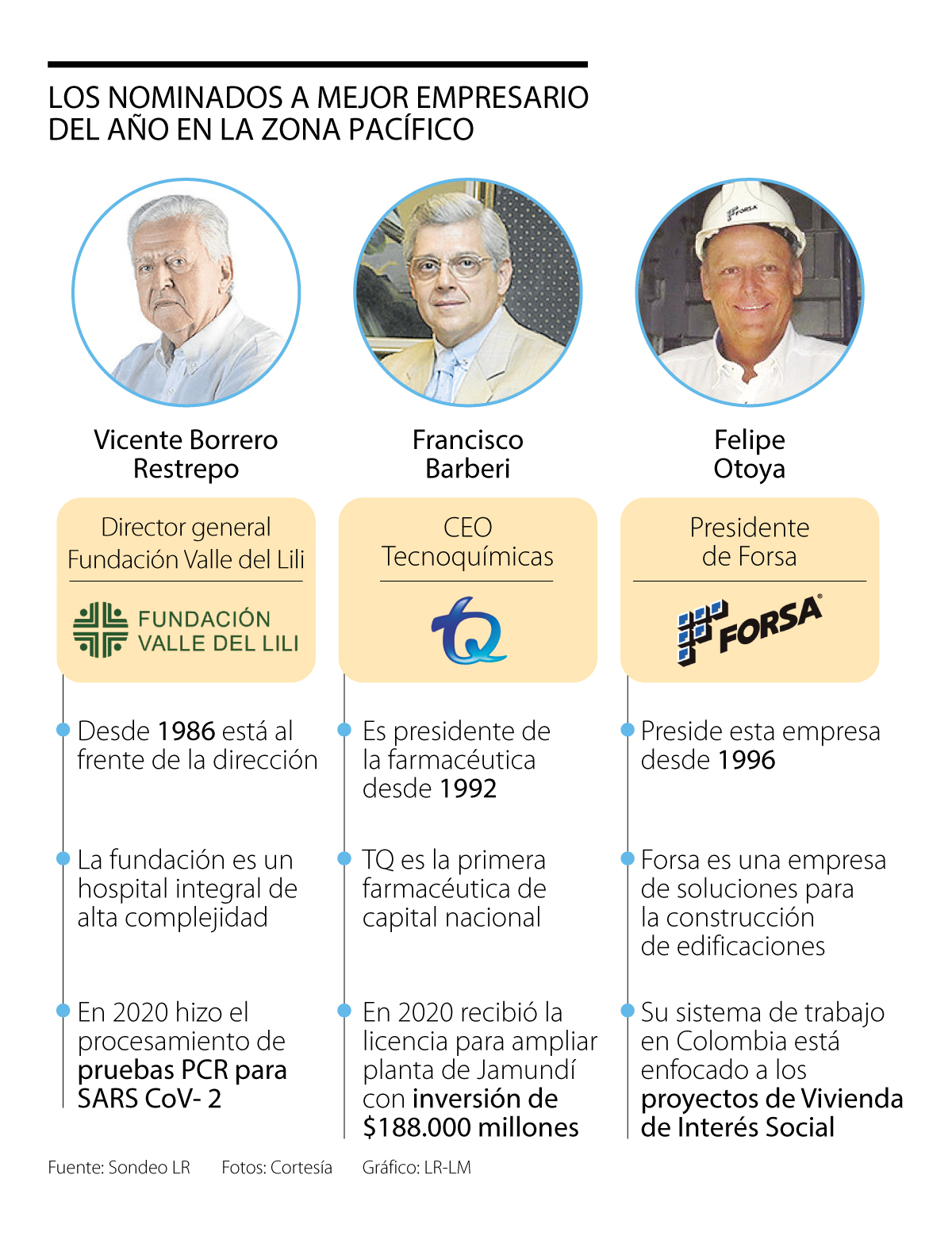 En este caso los tres empresarios seleccionados de la región pacífico son Vicente Borrero Restrepo, director general de la Fundación Valle de Lili; Francisco Barberi, CEO de la farmacéutica Tecnoquímicas, y Felipe Otoya, presidente de Forsa.