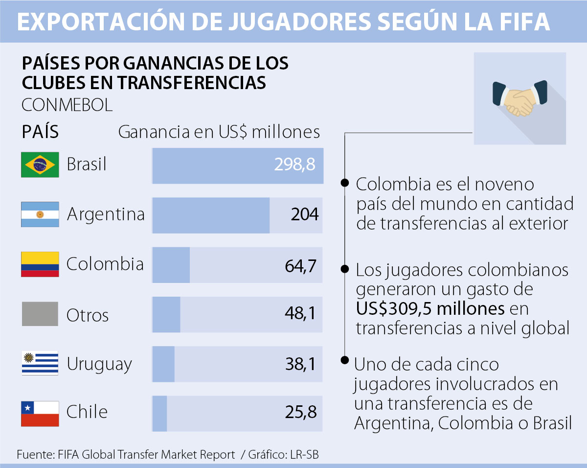 El informe detalló que el recaudo total en la transferencia de deportista a otras partes del mundo llegó a US$64,7 millones. Esta cifra significaría, entre otras cosas, 0,17% de las ventas externas totales que logró el país en el mismo año.
