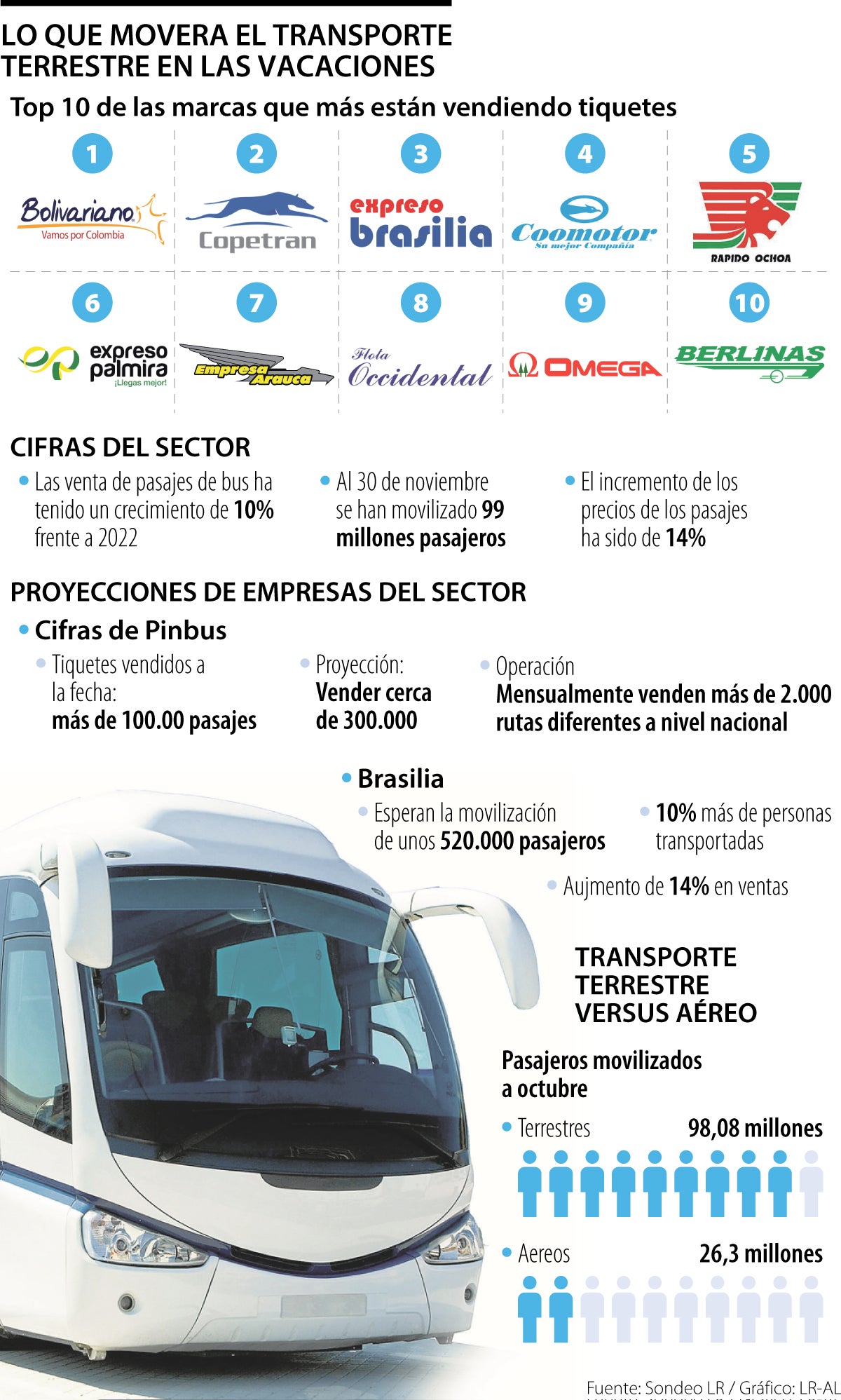 Y es que empresas de ventas de tiquetes de pasajes terrestre como Pinbus indicaron que “en lo corrido del año el valor promedio de los pasajes vendidos en Pinbus han tenido un aumento de 14%. Sin embargo, en el mes de diciembre vemos un aumento menor de 4% en comparación con diciembre del 2022”, explicó su gerente general, Alejandro Zuluaga.