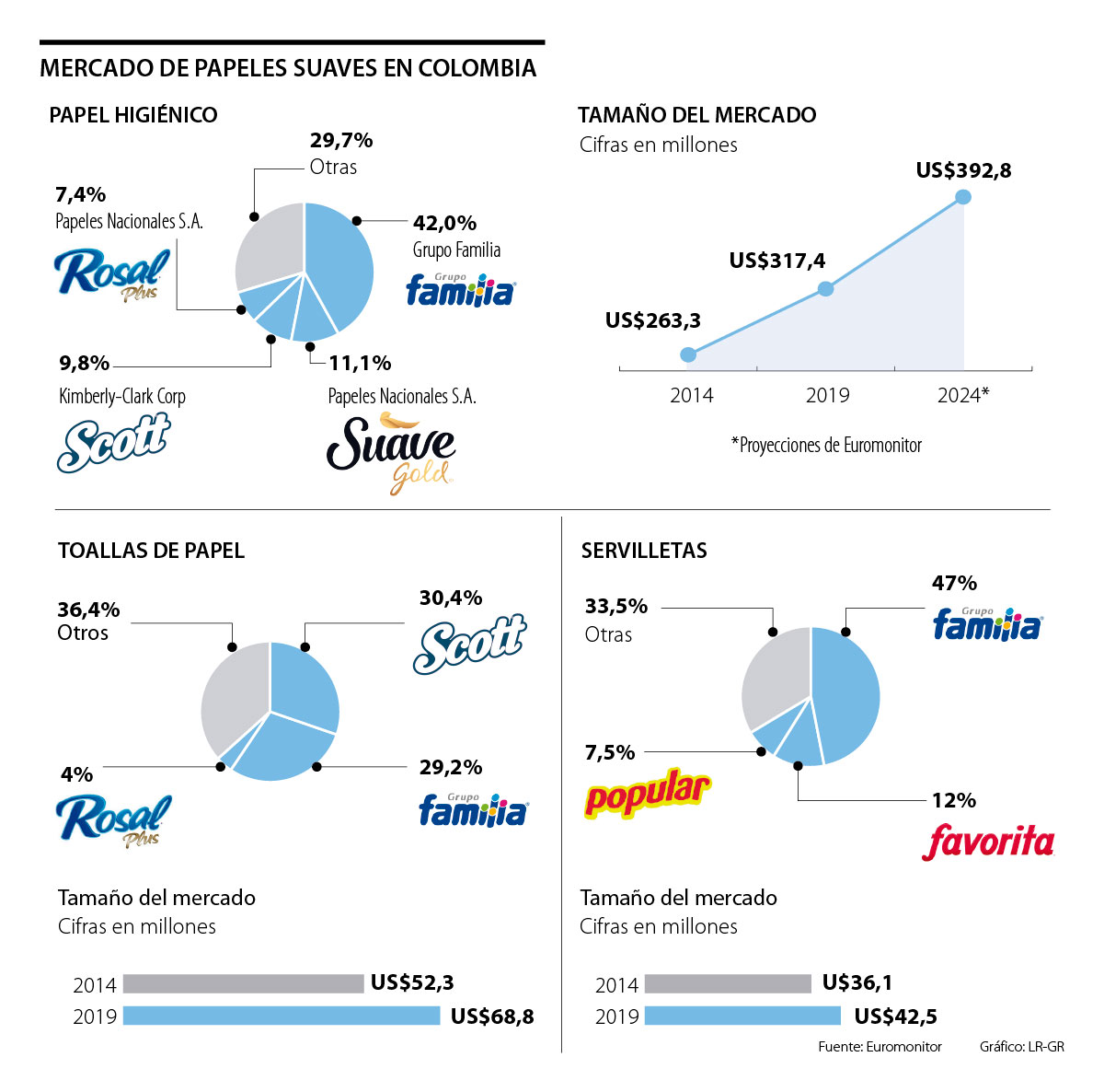 En Colombia, este mercado lo lidera el Grupo Familia, cuyo principal accionista es la compañía sueca Essity. Con su marca Familia, la empresa domina 42% de un mercado que el año pasado movió US$317,4 millones en el país y se proyecta moverá US$392,8 millones a 2024, según información de Euromonitor.