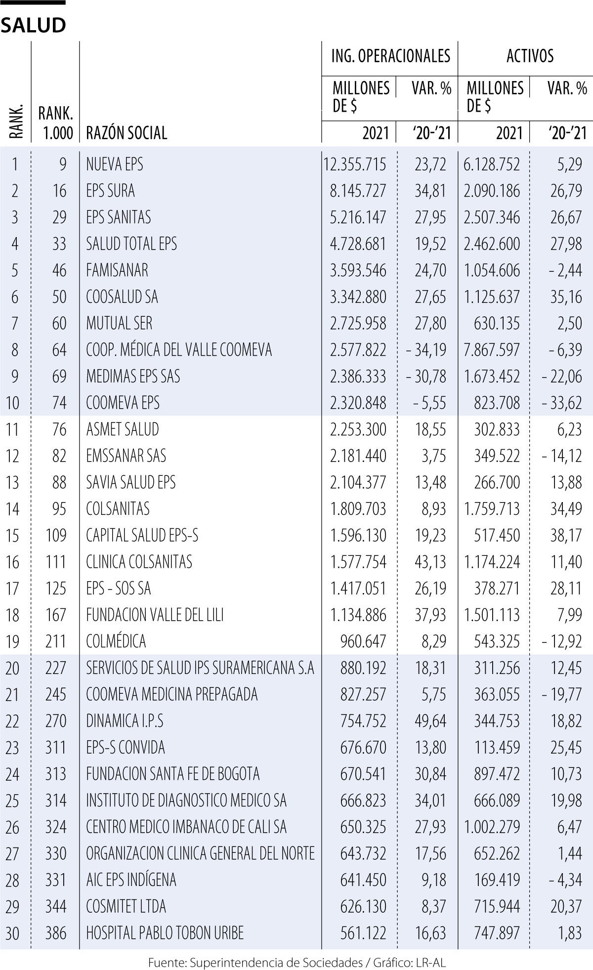 En esa línea, Nueva EPS lidera el sector con ingresos operacionales por $12,3 billones. Esta se caracteriza por atención, tanto subsidiada como contributiva. Se constituyó en marzo de 2007 y cuenta con más de ocho millones de afiliados. El año anterior tuvo ingresos por $9,9 billones, lo que representó una variación de 24,2%, respecto a 2020.
