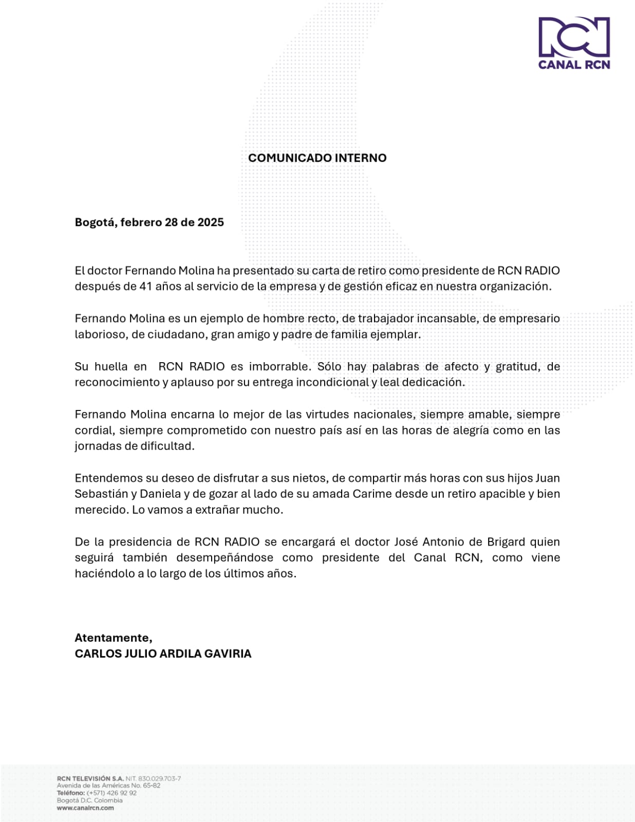 De la gestión de RCN Radio se encargará José Antonio de Brigard, quien seguirá también desempeñándose como presidente del Canal RCN, como viene haciéndolo a lo largo de los últimos años.