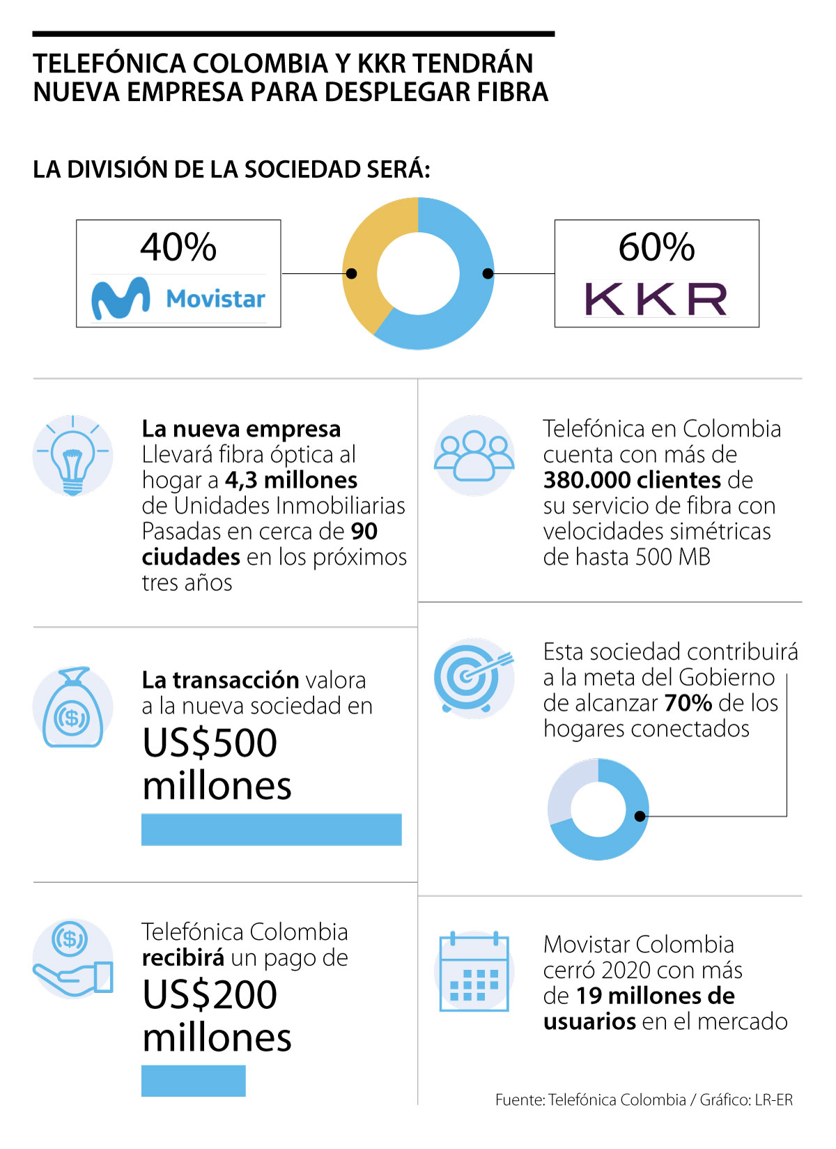 Telefónica Colombia, que opera en el país bajo la marca Movistar, y la firma de inversión KKR llegaron a un acuerdo para constituir una nueva sociedad que se encargará de llevar fibra óptica al hogar (Ftth) o neutra a 4,3 millones de Unidades Inmobiliarias Pasadas, en cerca de 90 ciudades en los próximos tres años.