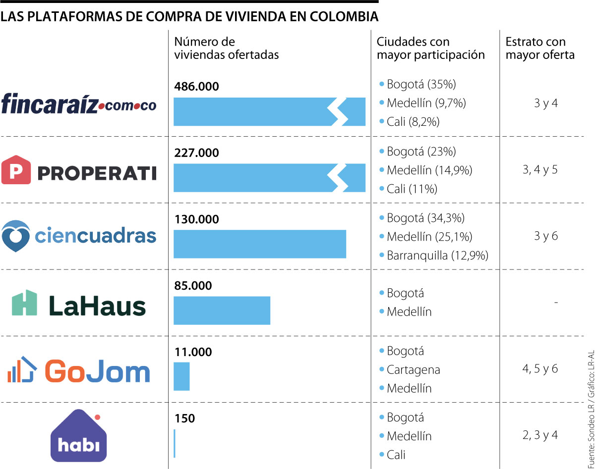 Actualmente, las de mayor oferta son Finca Raíz con 486.000 inmuebles; Properati, con 227.000 y Ciencuadras con 130.000. Otras, como La Haus, tiene 85.000; la peruana Gojom, cuenta con 11.000 y el emprendimiento Habi tiene 150.