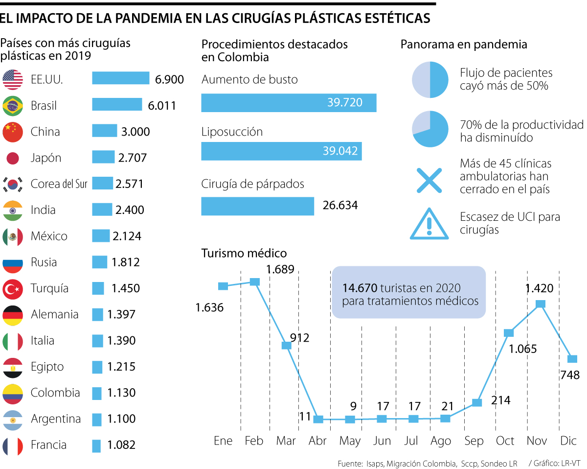 Según comentó Ernesto Barbosa, presidente de la Sociedad Colombiana de Cirugía Plástica Estética y Reconstructiva (Sccp), la atención de pacientes disminuyó más de 50% frente a 2019, año en el que, según registró la Sociedad Internacional de Cirugía Plástica Estética (Isap), se realizaron más de 1.130 procedimientos de este tipo en el país.