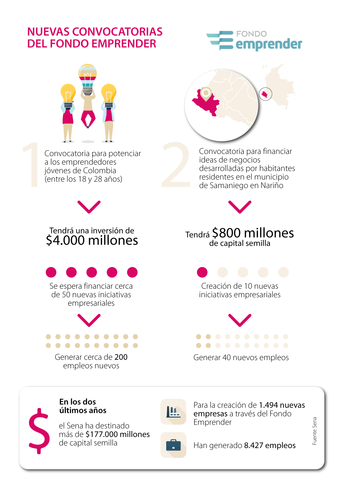 Por eso con el fin de continuar aportando recursos y seguir apoyando a los emprendimientos desarrollados por jóvenes y las iniciativas empresariales, el Sena lanzó dos nuevas convocatorias del Fondo Emprender: una para potenciar a los emprendedores jóvenes de Colombia (entre los 18 y 28 años) y otra para financiar ideas de negocios desarrolladas por habitantes residentes en el municipio de Samaniego en Nariño.