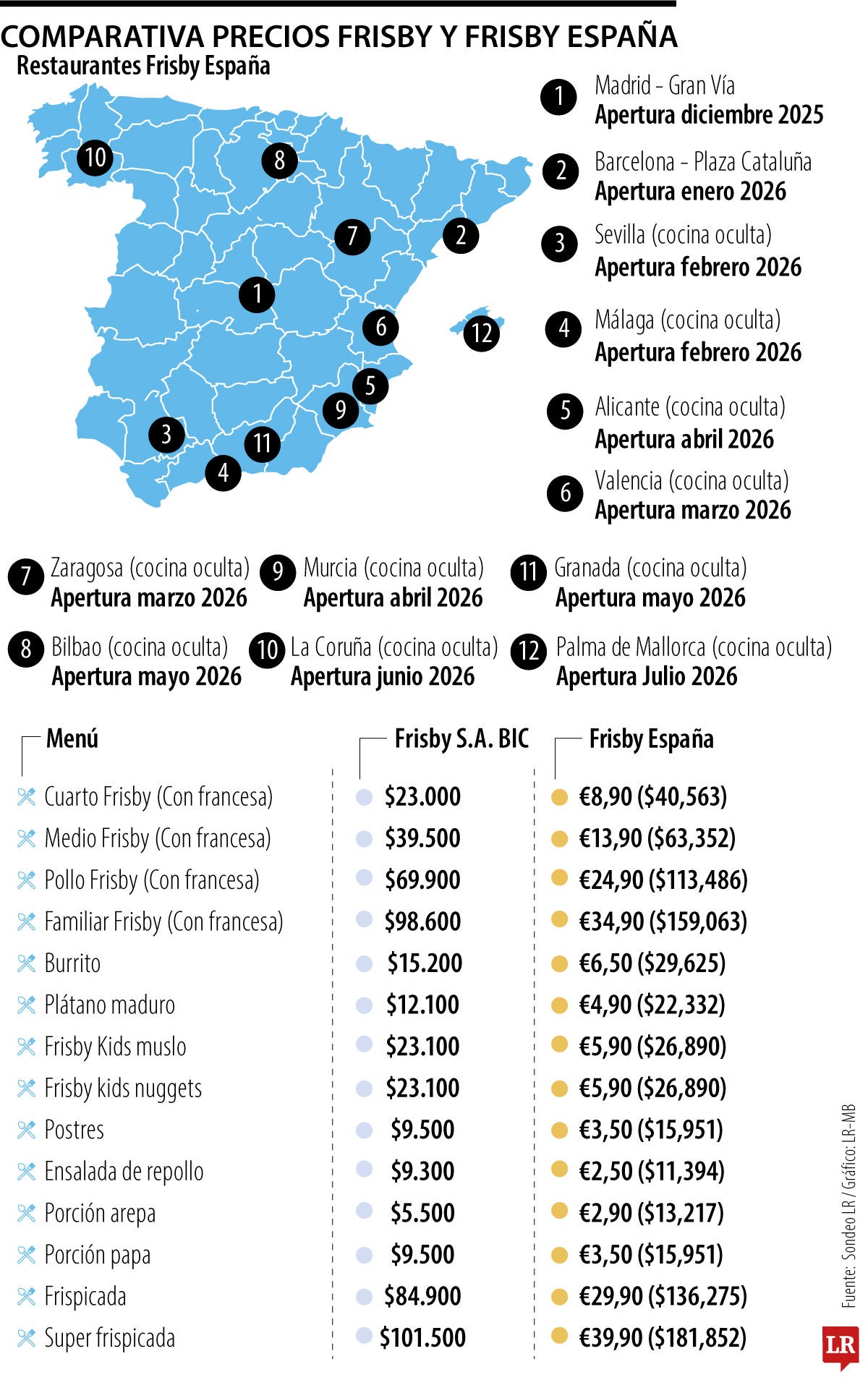 La polémica sociedad de origen bilbaíno, en su versión preliminar del menú, presenta en la sección de pollo apanado cuatro opciones: quarto frisby €8,90 ($26.892), medio frisby €13,90 ($63.344), pollo frisby €24,90 ($113.458) y familiar frisby €34,90 ($159.069). Aquí, los nombres son exactamente igual, en comparación con los precios colombianos, en el combo con papas francesas, son cuarto frisby a $23.000, medio frisby a $39.500, pollo frisby a $69.900 y familiar frisby a $98.600.