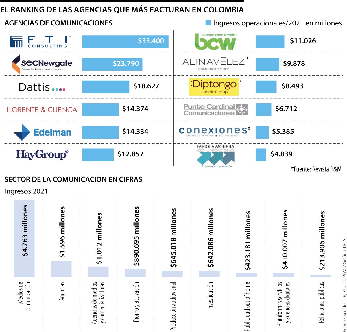 En el consolidado, se encontró que las tres agencias de comunicaciones más grandes de Colombia facturaron $75.817 millones en 2021. Estas tres primeras son FTI Consulting, SecNewgate y Dattis Comunicaciones.