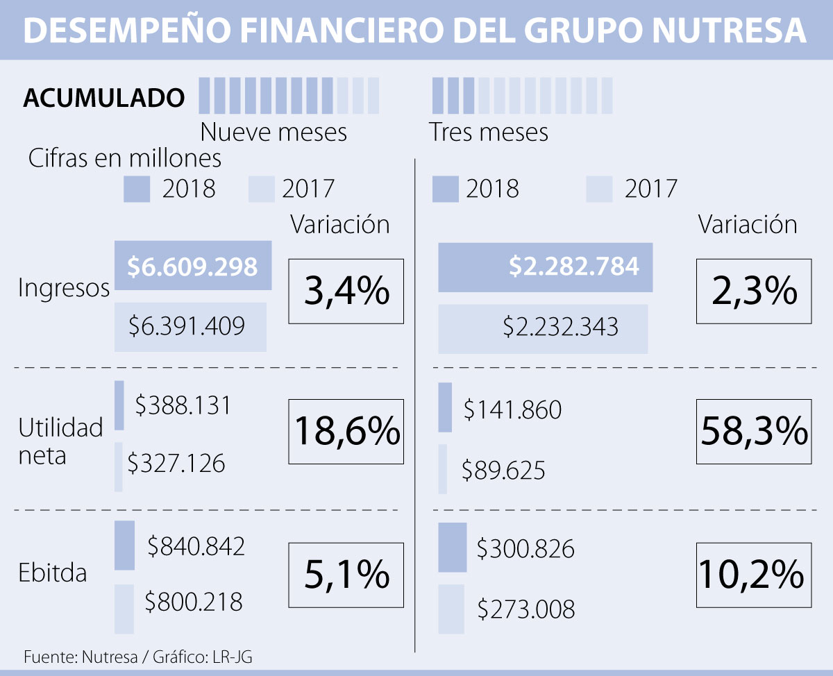 También las utilidades de la compañía tuvieron un incremento en el resultado consolidado. Grupo Nutresa pasó de ganar $327.126 millones entre enero y septiembre de 2017 a $388.131 millones entre enero y septiembre de este año. El alza representó un crecimiento de 18,6% frente al año anterior.