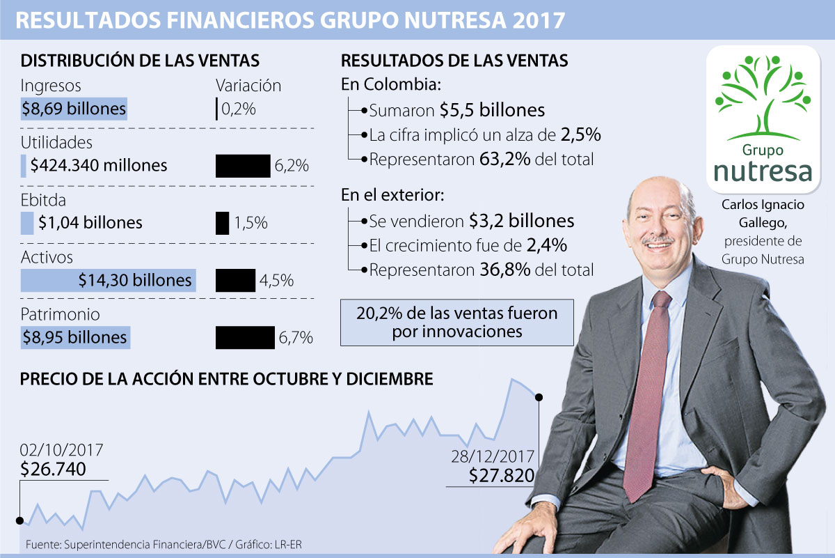 Respecto a las ventas, la empresa también publicó cifras positivas, aunque con un crecimiento más moderado. Según el balance, el Grupo Nutresa obtuvo ingresos por $8,7 billones, lo que representó una variación de apenas 0,2% frente a lo conseguido en 2016.