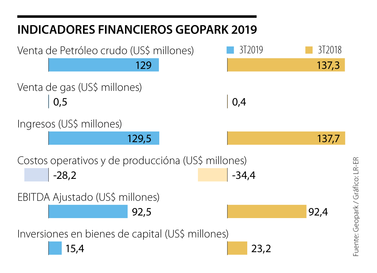 Geopark durante 2019 alcanzó una producción consolidada de crudo y gas de 41.786 barriles de petróleo equivalente por día aumentando 8%. En el cuarto trimestre de 2018 fue de 38.741 boepd.
