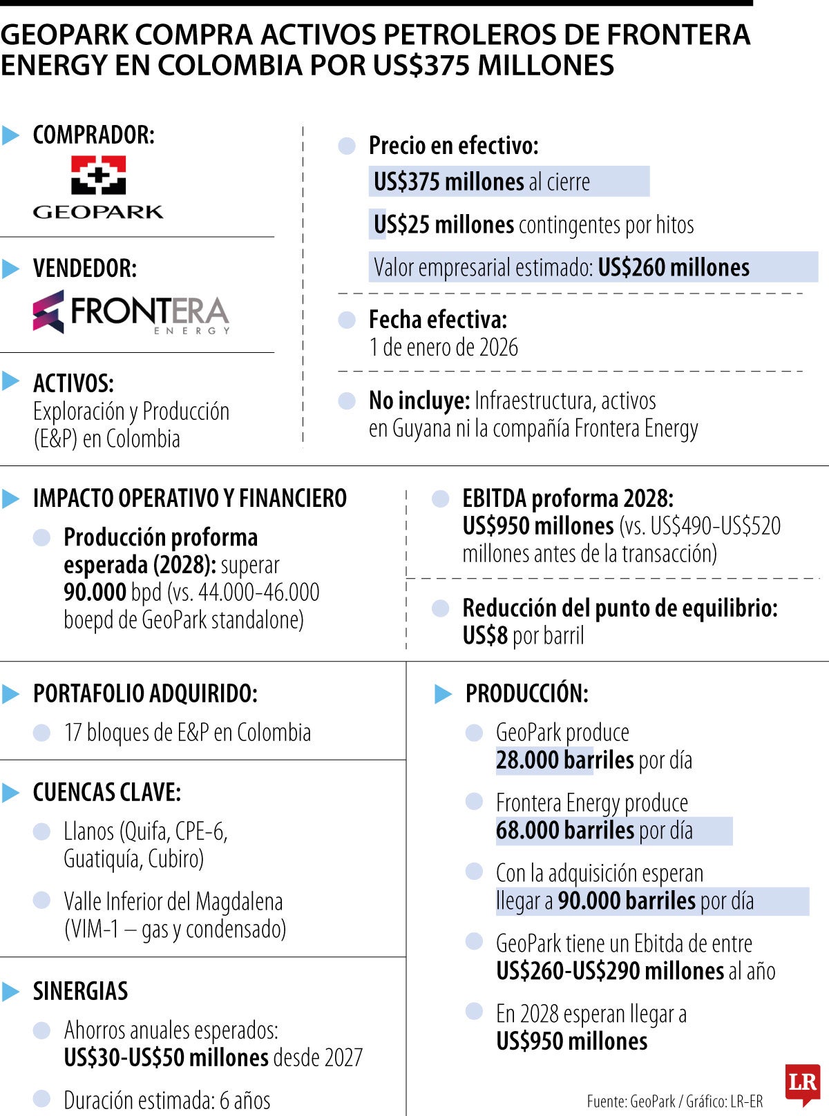 GeoPark cuenta con 28.000 barriles por día y, entre ambas compañías, suman alrededor de 68.000 barriles por día. Según informaron a LR, el plan es llegar a 90.000 en 2028. Con este movimiento, la compañía se convierte en la petrolera privada más grande del país. Además, Felipe Bayón, Chief Executive Officer de GeoPark, dijo que "tenemos un Ebitda entre US$260 - US$290 millones al año. Con esta compra llegaríamos en 2028 a US$950 millones de Ebitda".