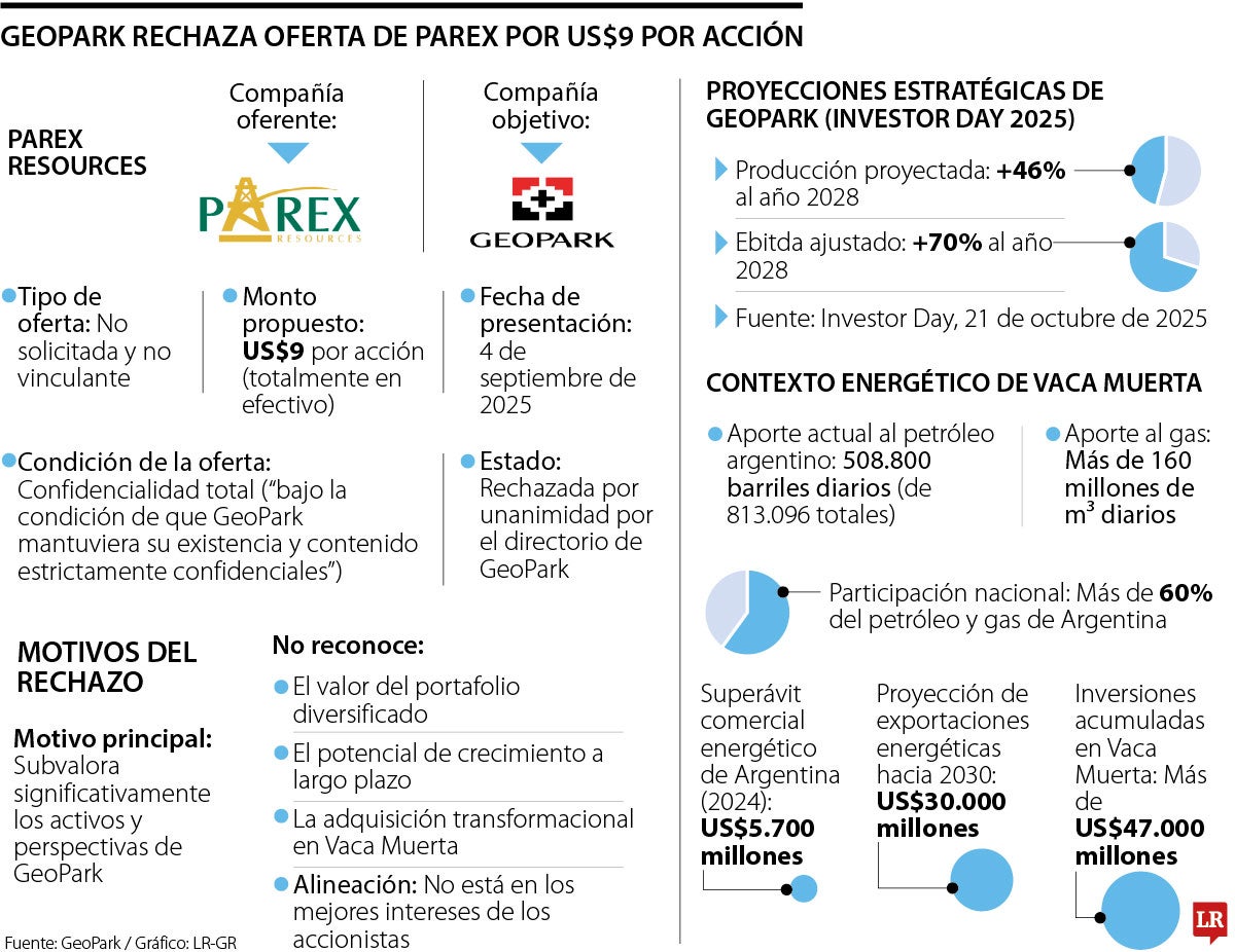 El directorio de GeoPark decidió cerrarle la puerta a una propuesta de adquisición por parte de Parex Resources, que buscaba quedarse con la compañía a través de una transacción en efectivo de US$9 por acción. La oferta, presentada el 4 de septiembre de 2025, llegó justo antes del anuncio de la entrada de GeoPark al yacimiento Vaca Muerta, en Argentina, y fue revisada a fondo por la alta dirección y sus asesores.