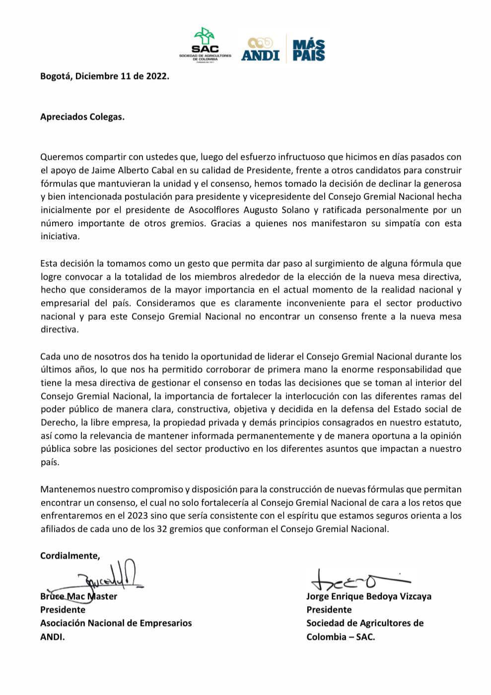 "Esta decisión la tomamos como un gesto que permita dar un paso al surgimiento de alguna fórmula que logre convocar a la totalidad de los miembros alrededor de la elección de la nueva mesa directiva, hecho que consideramos de la mayor importancia en el actual momento de la realidad nacional y empresarial del país", indica la carta firmada por Mac Master y Bedoya.