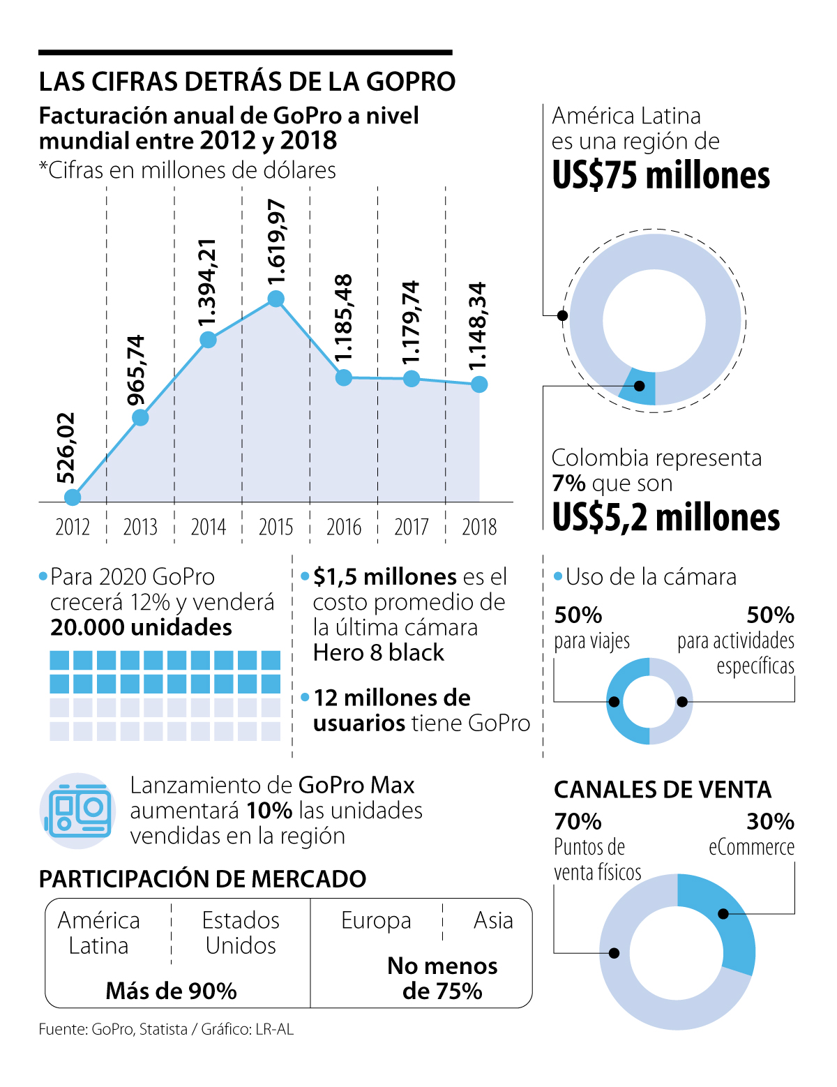 En cuanto a crecimiento, la empresa, que facturó más de US$1.148,34 millones en 2018, según cifras de Statista, espera tener un aumento de 12% al cierre de 2020, porque “nuestro mercado se ha desarrolla de una manera más agresiva de lo que se veía hace aproximadamente tres años, con una buena labor que hemos hecho como marca en el país y atendiendo las necesidades”, agregó el vocero de GoPro en Colombia.