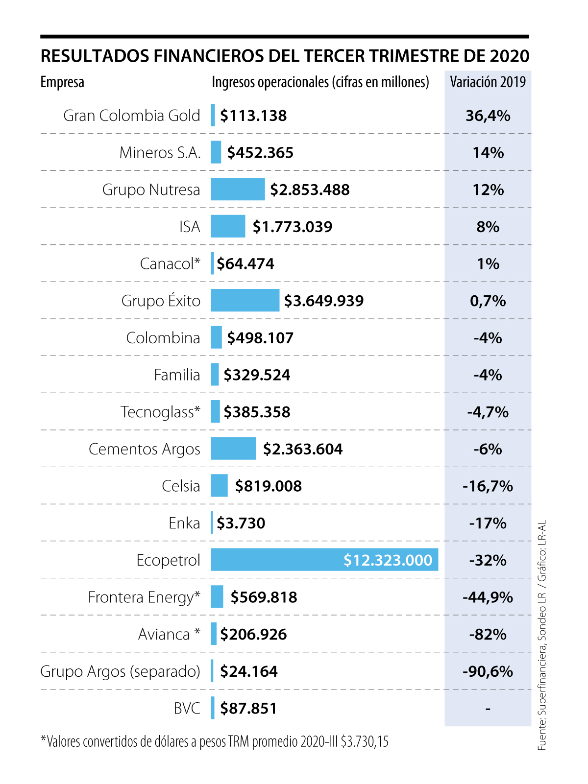 Otras empresas que terminaron el periodo en terreno positivo en términos de ingresos operacionales frente al tercer trimestre de 2019 fueron: Grupo Nutresa (12%); ISA (8%); Canacol (1%) y Grupo Éxito (0,70%).