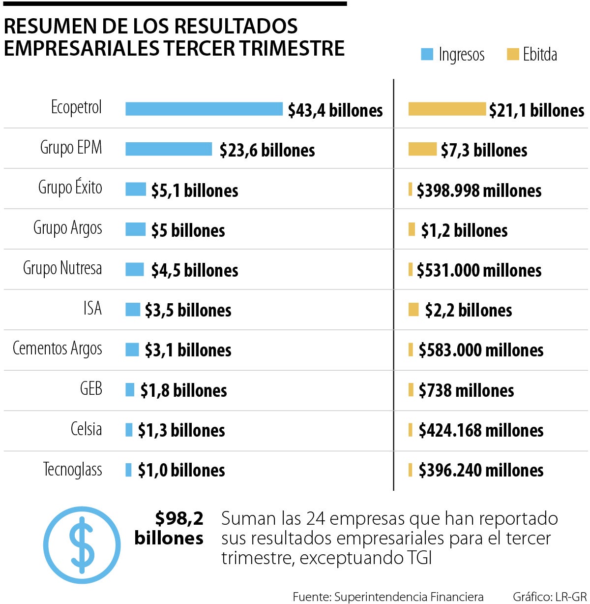 La ronda de resultados empresariales al tercer trimestre no para de crecer. En la última semana se sumaron siete organizaciones con un aporte de $9,3 billones a los ingresos del período. Estas fueron Grupo Argos, Grupo Energía Bogotá, Alpina, Carvajal Empaques, Mineros, Procafecol y TGI. Esta última presentó su desempeño en términos de puntos porcentuales.