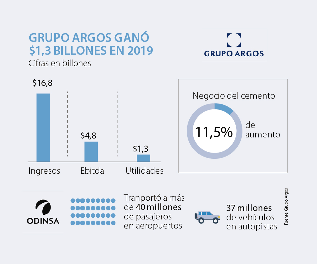 En 2019, el Grupo Argos alcanzó ingresos consolidados por $16,8 billones, con un crecimiento anual de 18%, cifra que le permitió llegar a $1,3 billones en utilidades netas.