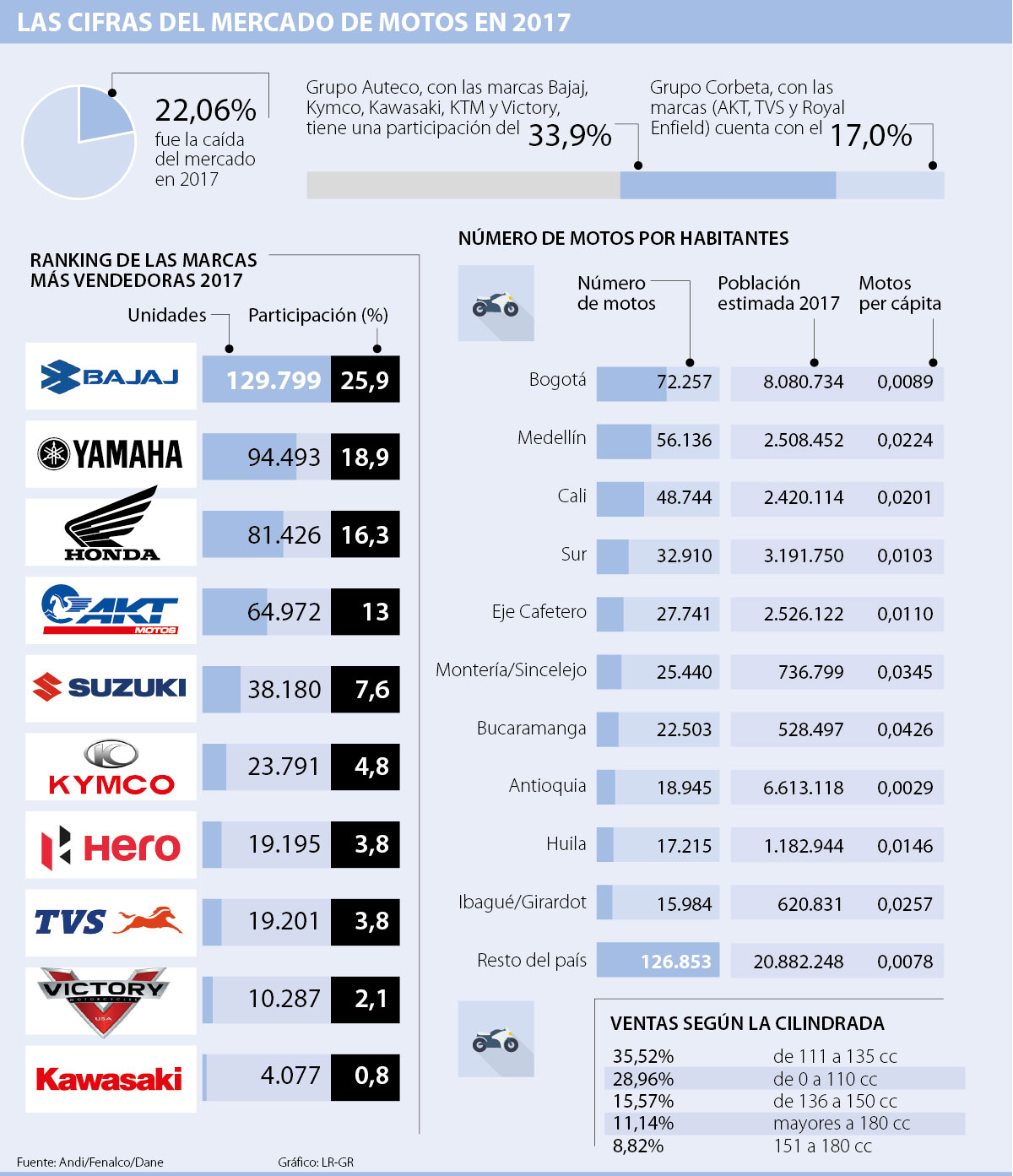 Más allá del impacto social el mercado de las motos es un sector que tiene características propias. El negocio está en manos del grupo Auteco y el grupo Corbeta que tienen 51% de participación.
