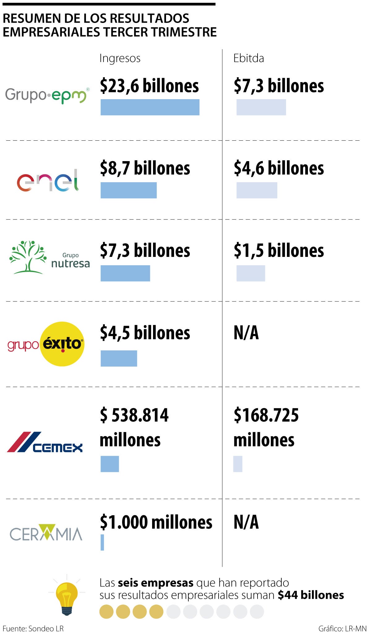 Según los resultados que han sido publicados en el último mes, la organización que más ha registrado ingresos es Grupo EPM, con ingresos reportados por $23,6 billones, de los cuales, EPM matrix aportó $9,8 billones, correspondiente a 41% del total. A su vez, la empresa también reportó un Ebitda de $7,3 billones de los cuales $4,2 fueron aportados por EPM, 58% de la participación.