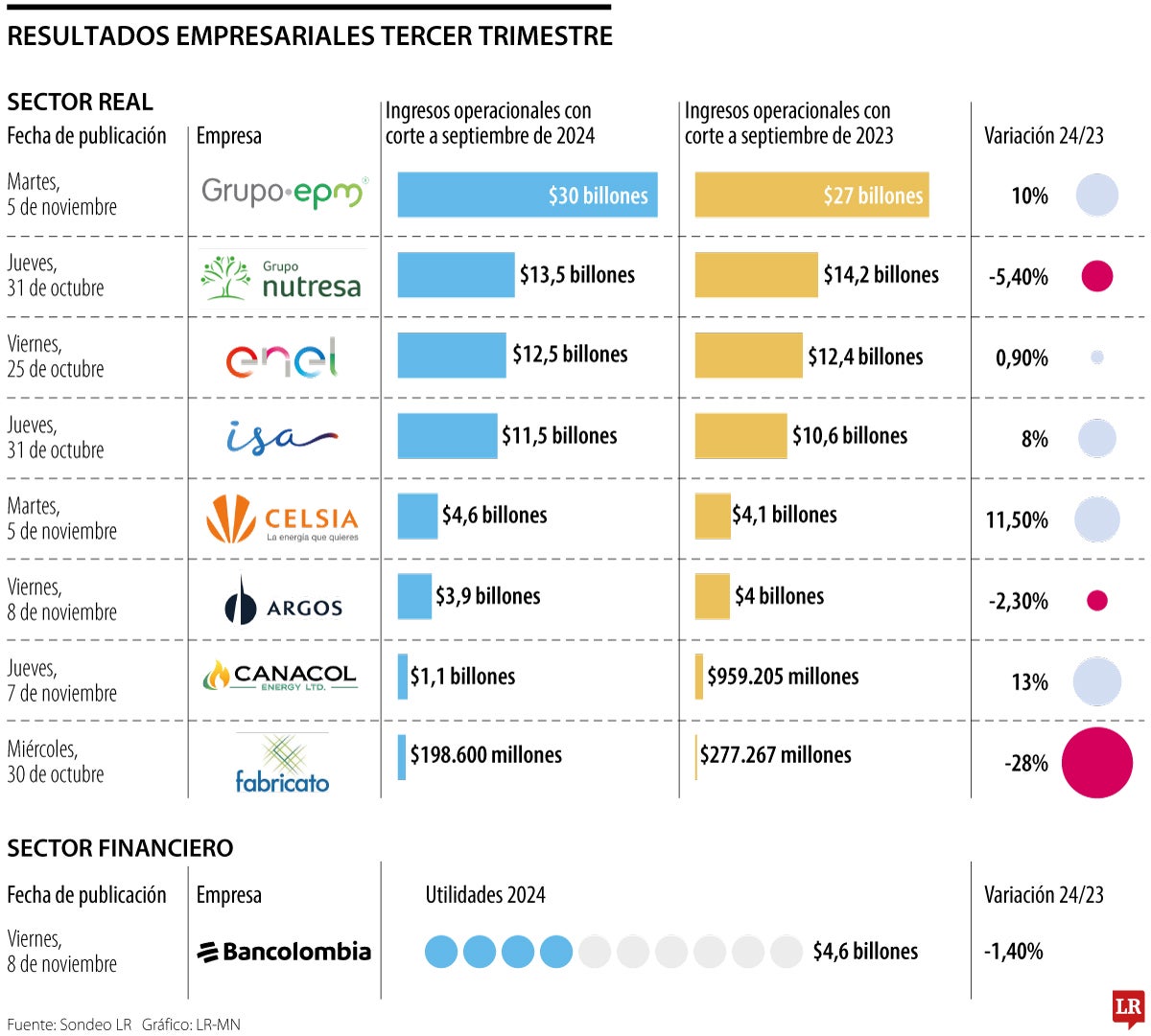 Nutresa y Enel siguen en el listado con $13,5 billones y $12,5 billones, respectivamente. La empresa de alimentos cayó 5,4%, mientras que la compañía de energía reportó un ligero aumento de 0,90%. Las empresas de energía han tenido repuntes importantes en ingresos. ISA ratificó un crecimiento de 8% si se compara los $11,5 billones obtenidos hasta septiembre con los $10,6 billones del mismo periodo de 2023.