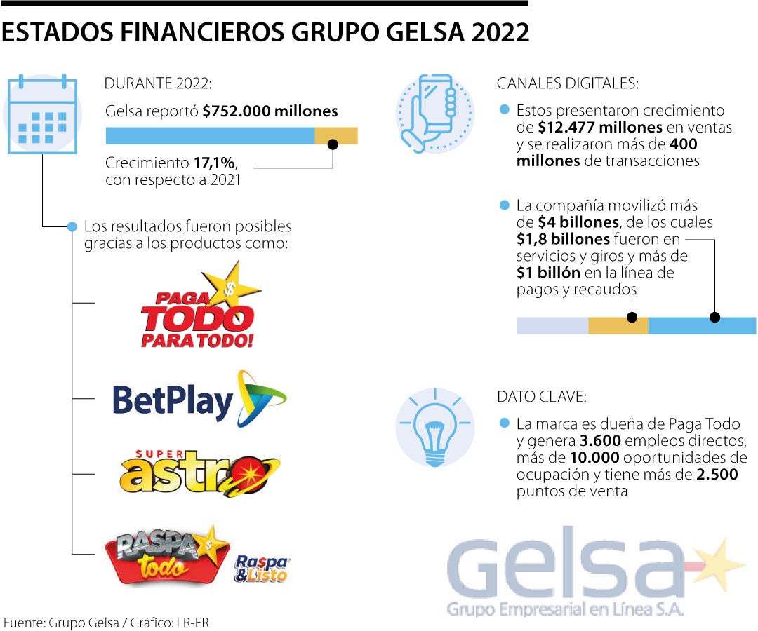 El Grupo Empresarial en Línea S.A - Grupo Gelsa reportó durante 2022 ingresos por $752.000 millones y crecimiento de 17,1%, con respecto a 2021. Estos resultados fueron posibles, según la compañía, por el auge de productos como el Chance, seguido por BetPlay, Super Astro, Raspa Todo y Giros.