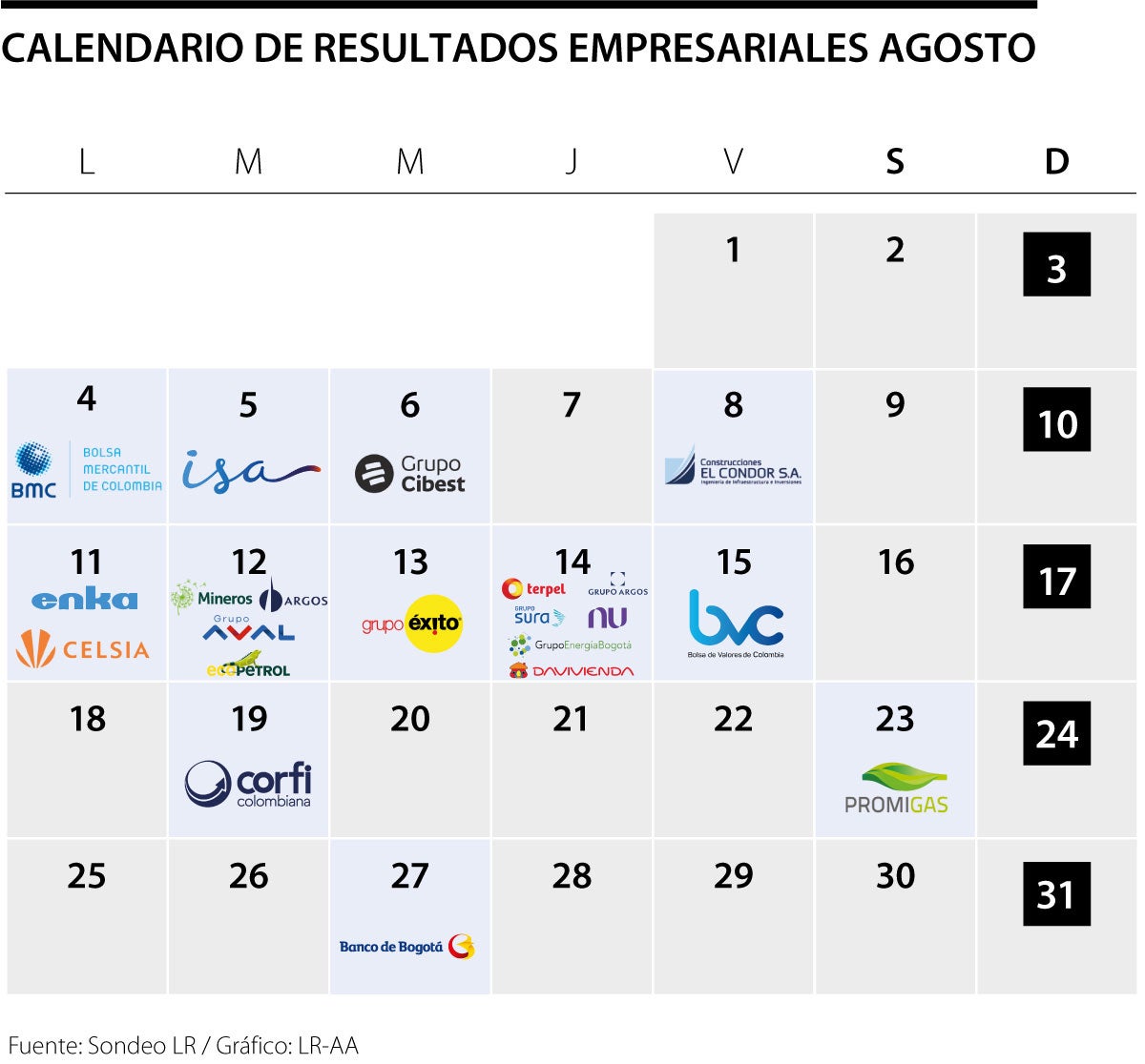 La Bolsa de Valores de Colombia publicará el 15 sus resultados. Por último está Corfi Colombiana que los hará públicos el martes 19 y el Banco de Bogotá que esperará hasta la última semana del mes. Para ser más precisos, el miércoles 27, cerrando el mes de resultados.