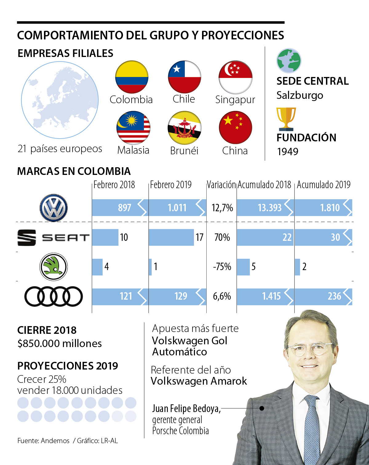 Así lo confirmó a LR Juan Felipe Bedoya, gerente general del grupo, quien recalcó que para ello serán claves algunos lanzamientos de las cuatro marcas que comercializa actualmente en Colombia: Volskwagen, Audi, Seat y Skoda.