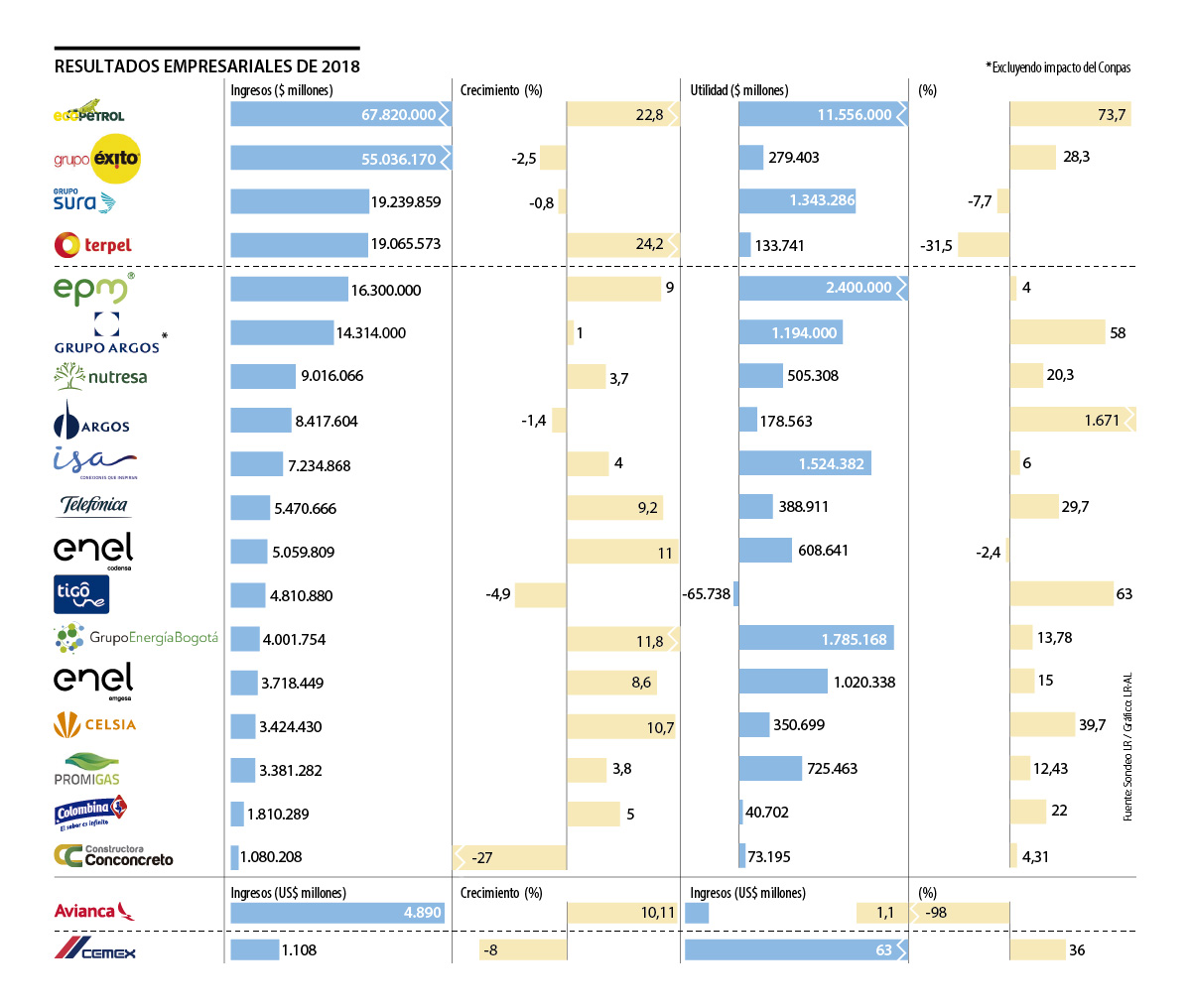 Con el cierre del primer trimestre de 2019, la mayoría de compañías con operación en Colombia ya presentaron sus estados financieros consolidados de 2018. Mientras que Ecopetrol y Grupo Éxito mantuvieron el liderato que ostentaron en 2017 por ser las de mayores ingresos, el cambio estuvo en el tercer lugar, al cual entró Grupo Sura con ingresos por $19,24 billones.