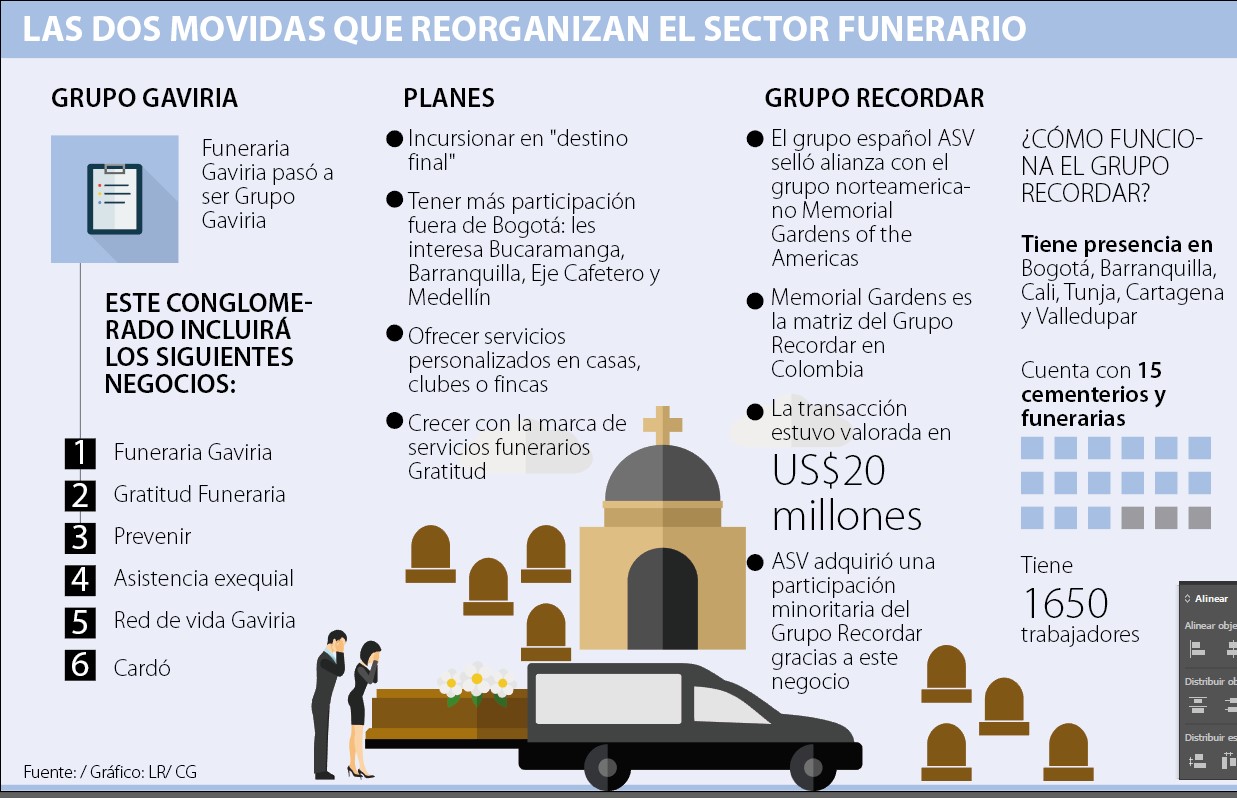 El mercado funerario toma un nuevo rumbo con los cambios en dos de las más importantes empresas del sector: Grupo Gaviria y Grupo Recordar. La primera, dio el salto para convertirse en conglomerado y acoger seis negocios; mientras que la segunda recibió a la organización española ASV como socia minoritaria.