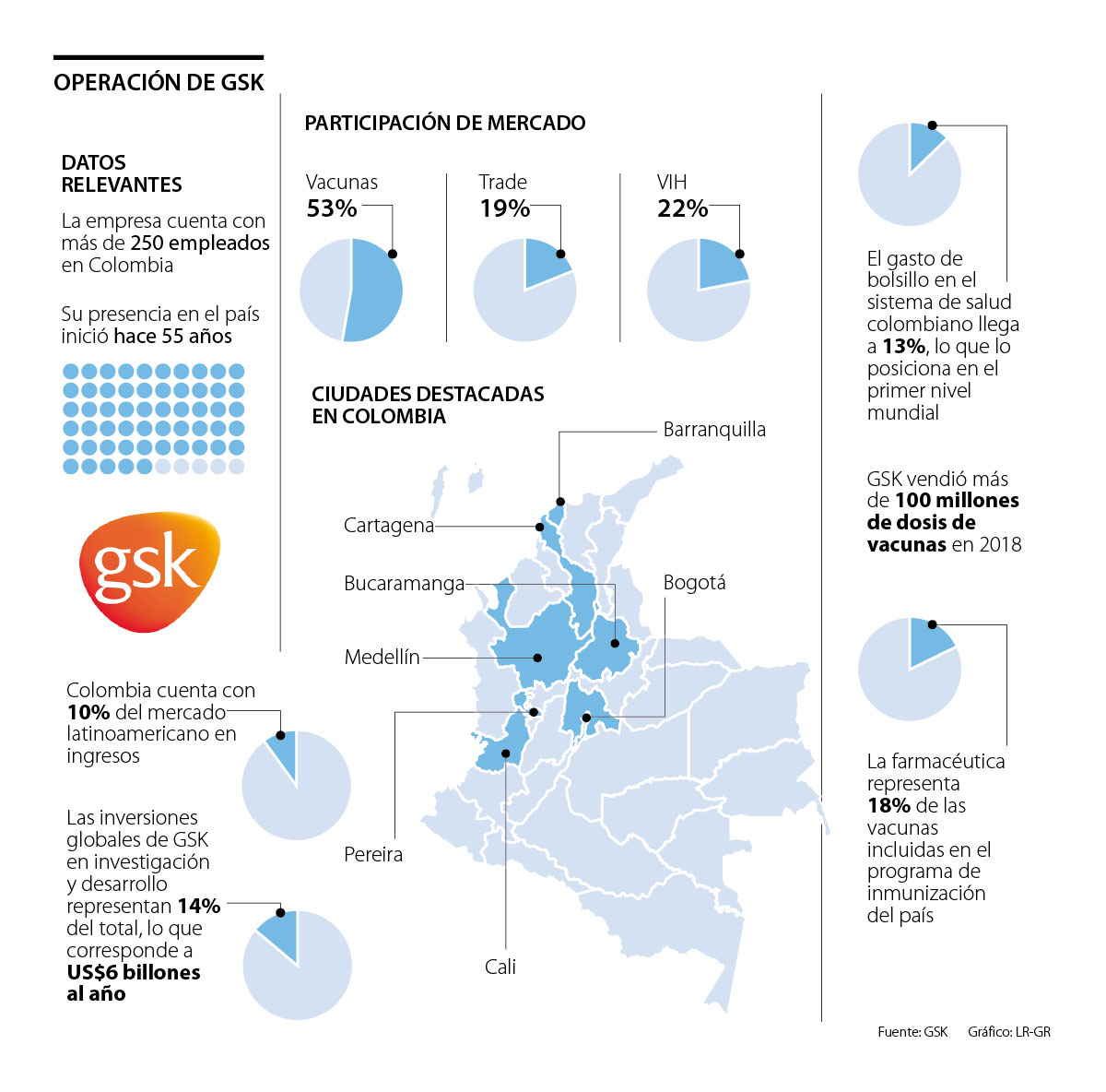En Colombia, GSK se destaca principalmente en la producción de vacunas, pues se posiciona como el mayor fabricante del mundo. En el país, este rubro representa hasta 50% de sus ingresos, que para 2018 significaron 100 millones de dosis.