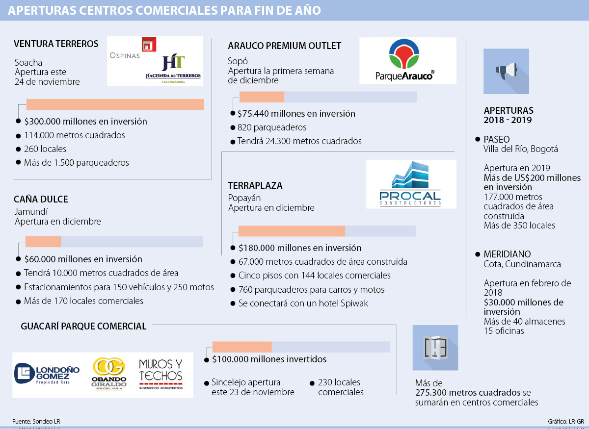 Por área, el cuatro mall que se inaugurará está ubicado en Sopó y es el primero de su tipo en Colombia. Se trata de Arauco Premium Outlet, la nueva apuesta de la chilena Parque Arauco, que desde 2008 está haciendo pinitos y ya cuenta con tres centros comerciales.