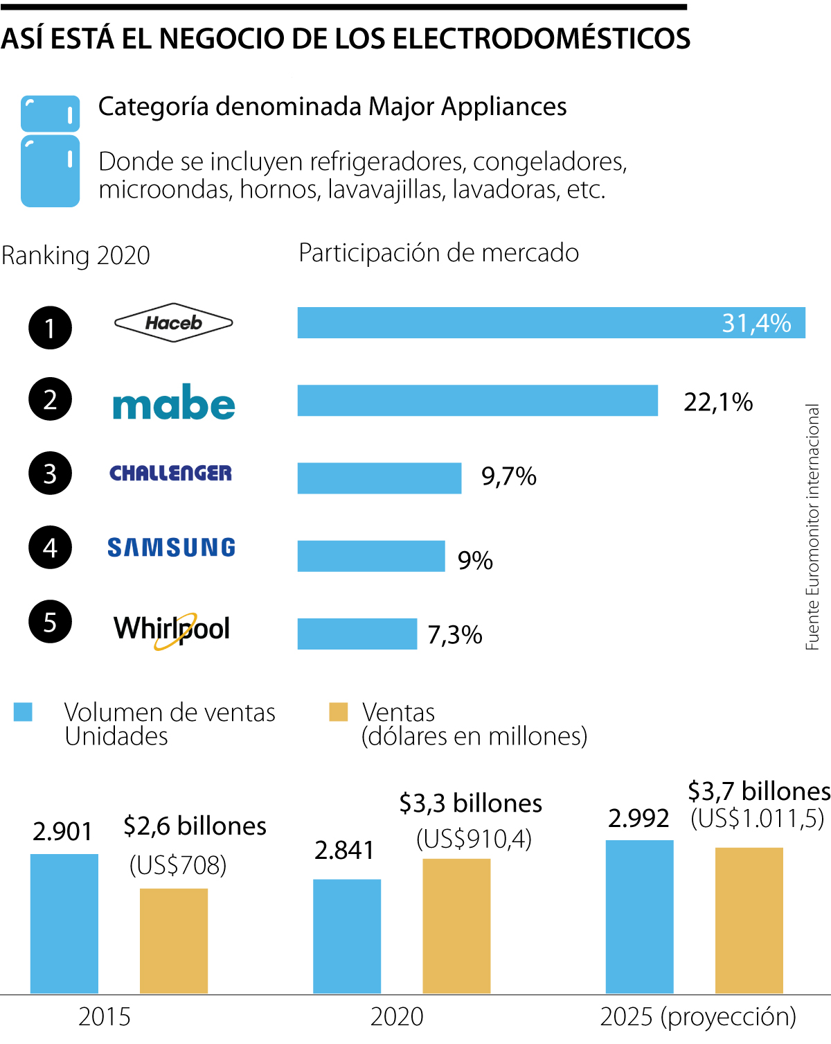 En cuanto al top tres de las empresas que lideraron esta industria, dos colombianas siguen dominando el conteo. La antioqueña Haceb tiene una participación de 31,4%, seguida de Mabe (22,1%), y luego aparece la otra local, Challenger, que cuenta con 9,7% de la torta. Más abajo se ubican Samsung (9%), y Whirlpool (7,3%).