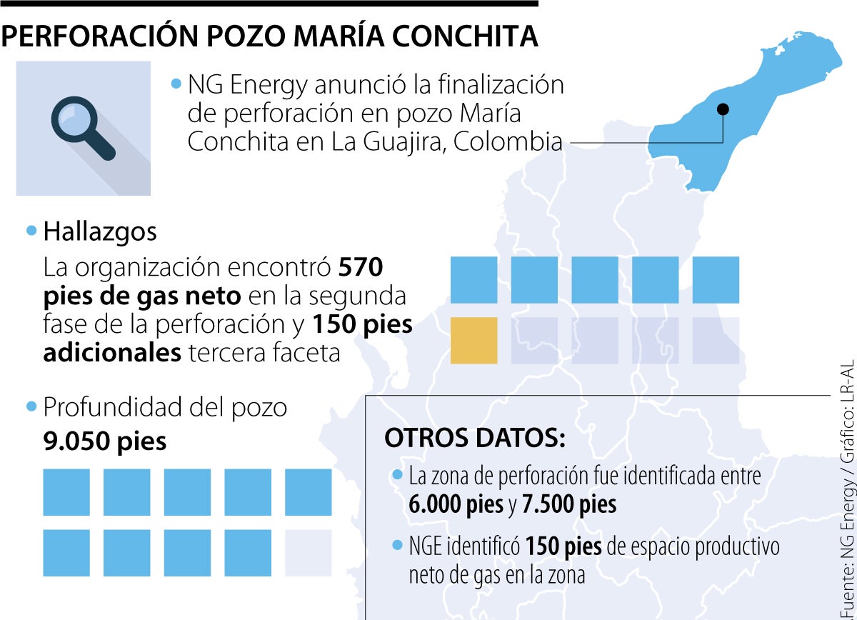 NG Energy anunció la finalización de perforación en pozo María Conchita en La Guajira, Colombia. La organización encontró 570 pies de gas neto en la segunda fase de la perforación y 150 pies adicionales tercera faceta, además, la exploración alcanzó una Profundidad Total (TD) de 9,050 pies.